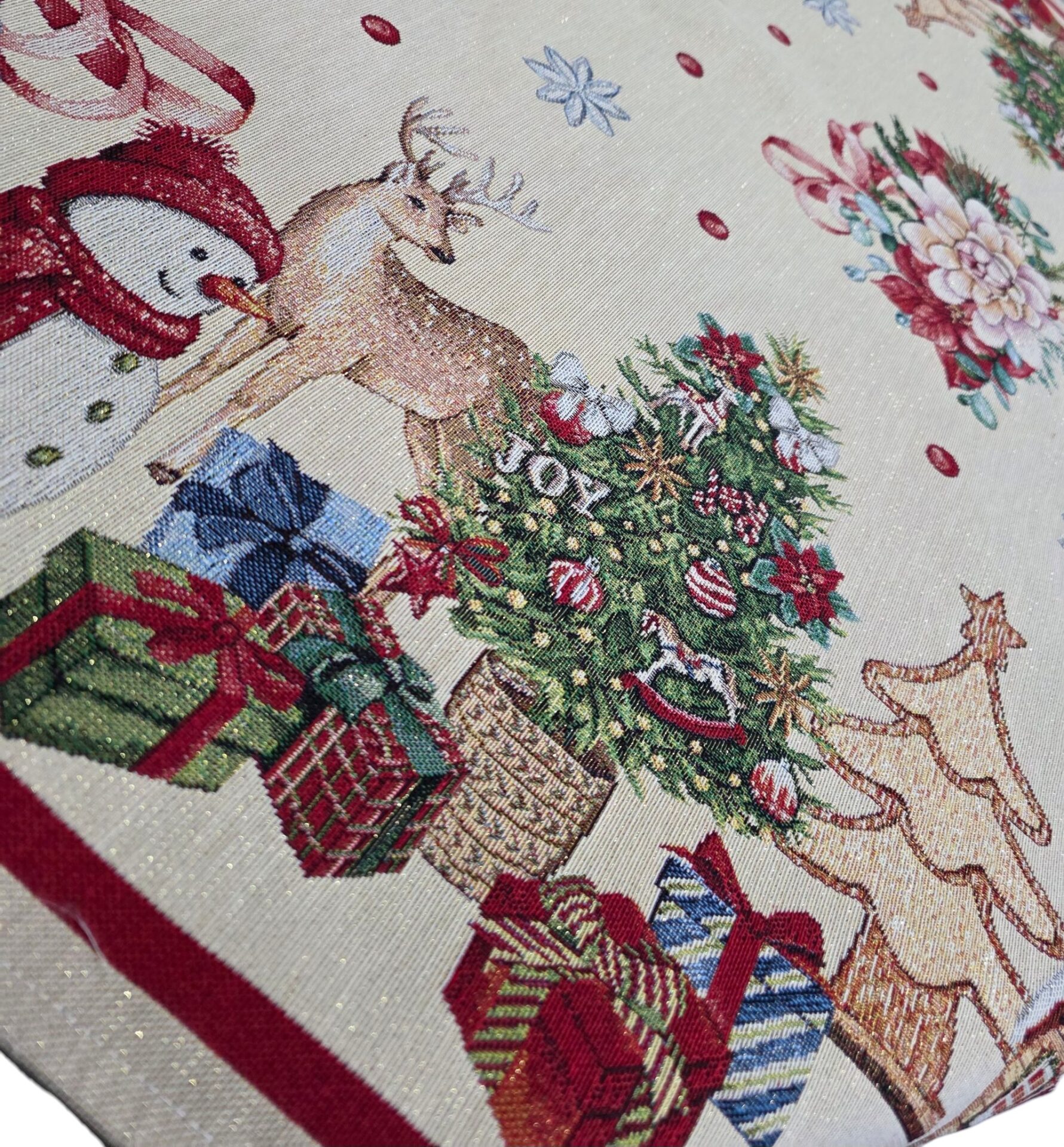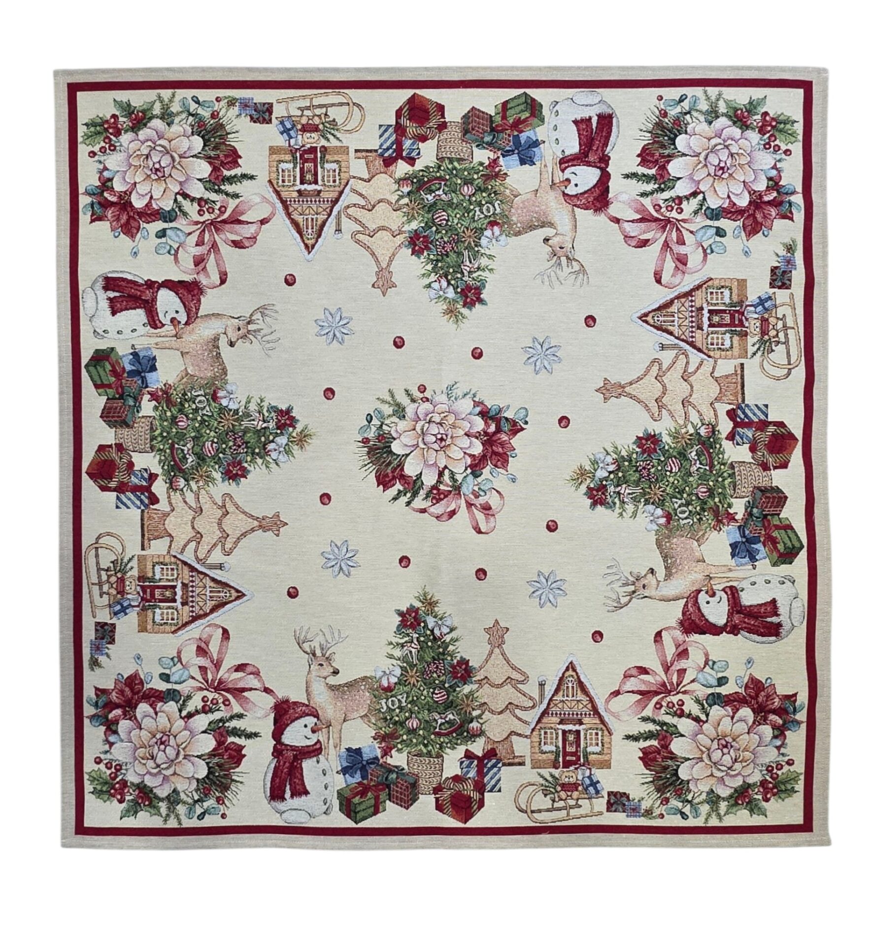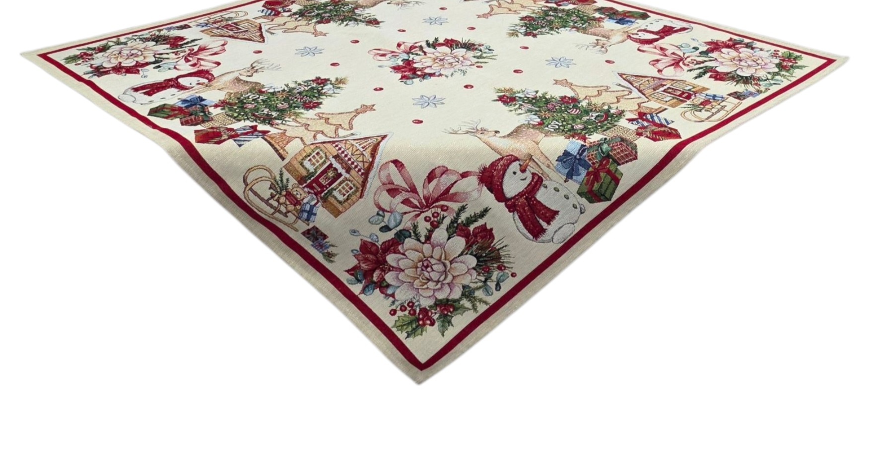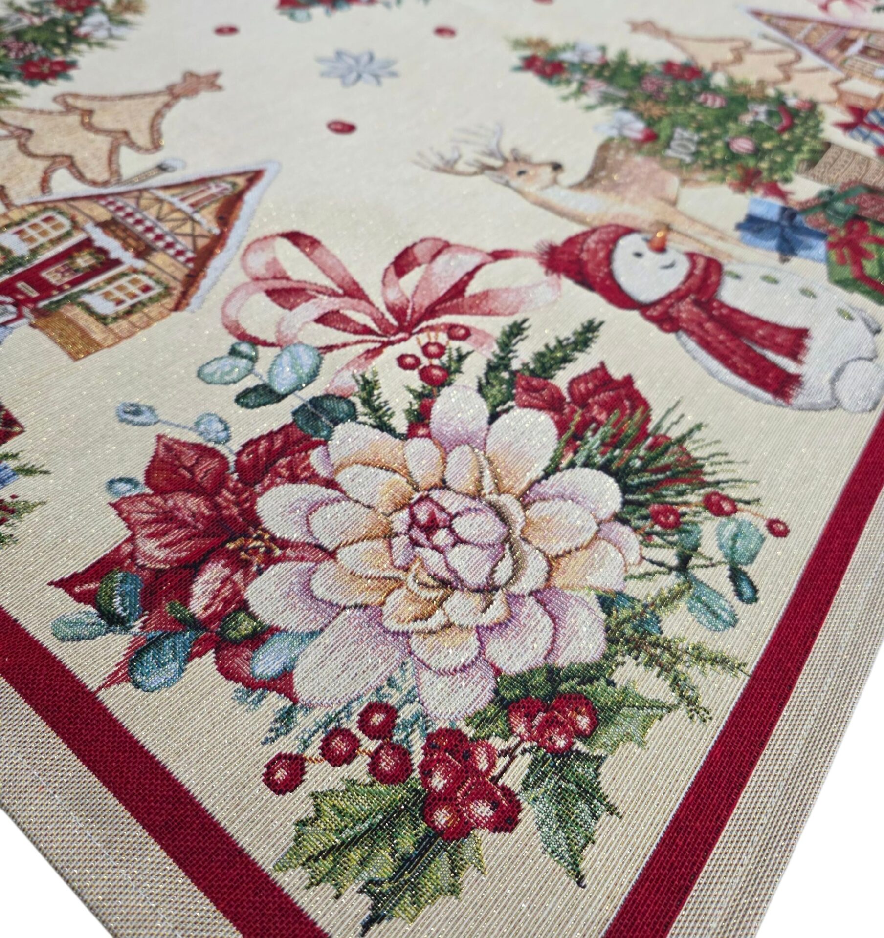 Trasforma la tua tavola in un’incantevole scena natalizia con questo magnifico centrotavola in gobelin dalle dimensioni generose di 100×100 cm. Il design festivo presenta una deliziosa composizione di elementi natalizi tradizionali: alberi decorati in pan di zenzero, allegre renne, simpatici pupazzi di neve e graziose casette invernali, tutti arricchiti da dettagli scintillanti in lurex. La bordatura rossa elegante incornicia perfettamente la scena su sfondo chiaro, mentre i motivi floreali natalizi con bacche e agrifoglio aggiungono un tocco di naturalezza alla composizione. I colori vivaci e i dettagli finemente tessuti creano un’atmosfera accogliente e festosa, perfetta per le celebrazioni natalizie. Il tessuto in gobelin garantisce resistenza e durata nel tempo, mentre il design versatile si adatta perfettamente sia a tavole classiche che moderne. Un accessorio decorativo che diventerà il centro dell’attenzione durante le tue feste natalizie.