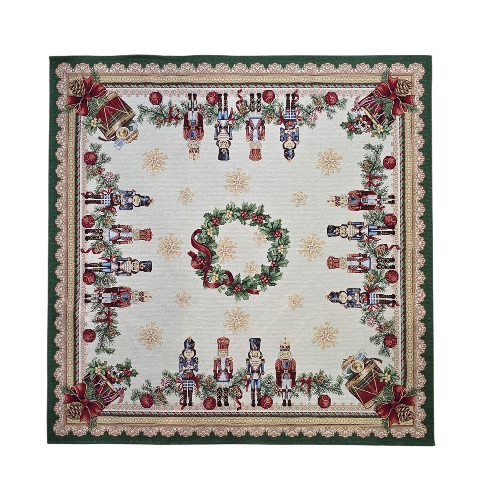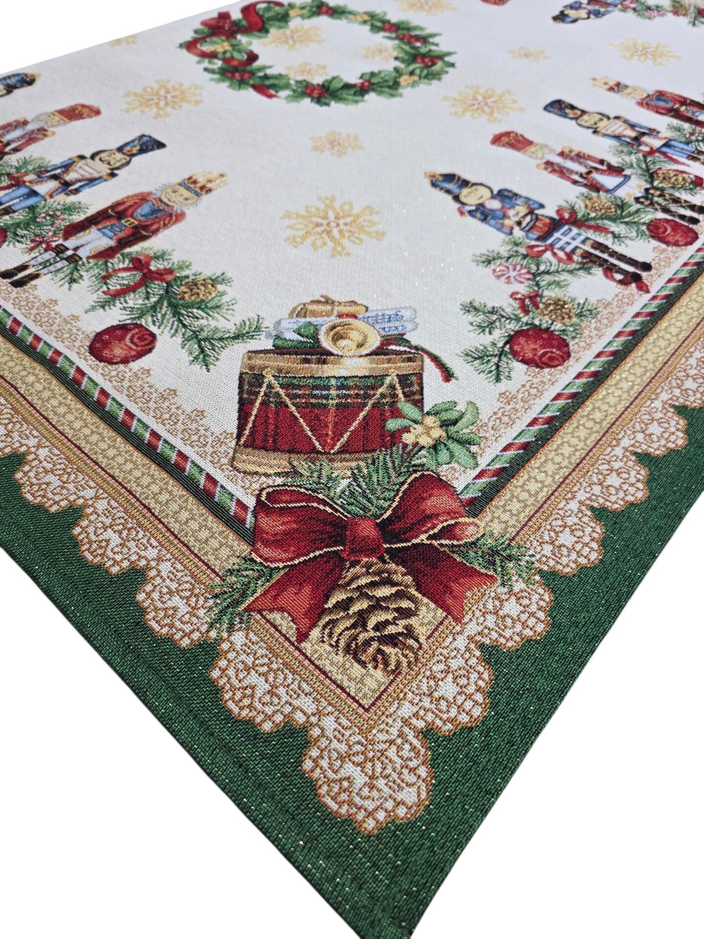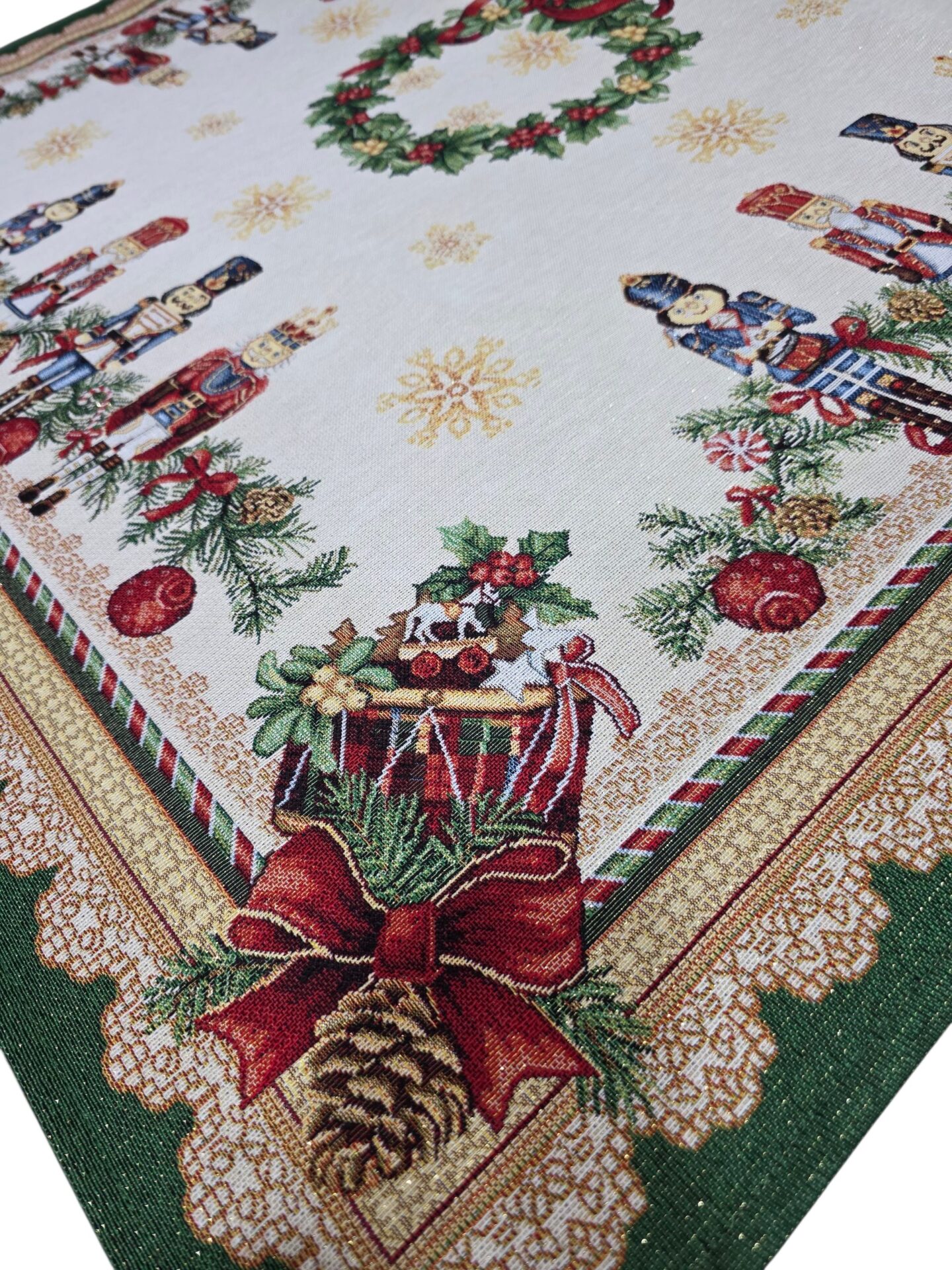 Trasforma la tua tavola natalizia con questo magnifico centrotavola in stile Gobelin, un’opera d’arte tessile che cattura perfettamente la magia del Natale. Con le sue dimensioni generose di 100x100cm, questo elegante centrotavola presenta un affascinante motivo ispirato allo Schiaccianoci, con deliziosi soldatini che decorano il bordo. Il design include una splendida ghirlanda centrale, decorazioni natalizie tradizionali e dettagli in lurex che aggiungono un tocco di brillantezza festiva. Il bordo verde è impreziosito da un raffinato motivo di pizzo, mentre gli angoli sono decorati con fiocchi rossi e pigne. I colori predominanti – il verde, il rosso e il bianco – si fondono armoniosamente creando un’atmosfera natalizia classica e accogliente. Il tessuto Gobelin garantisce resistenza e qualità, rendendo questo centrotavola un elemento decorativo perfetto per le festività e un prezioso complemento d’arredo che può essere tramandato di generazione in generazione.