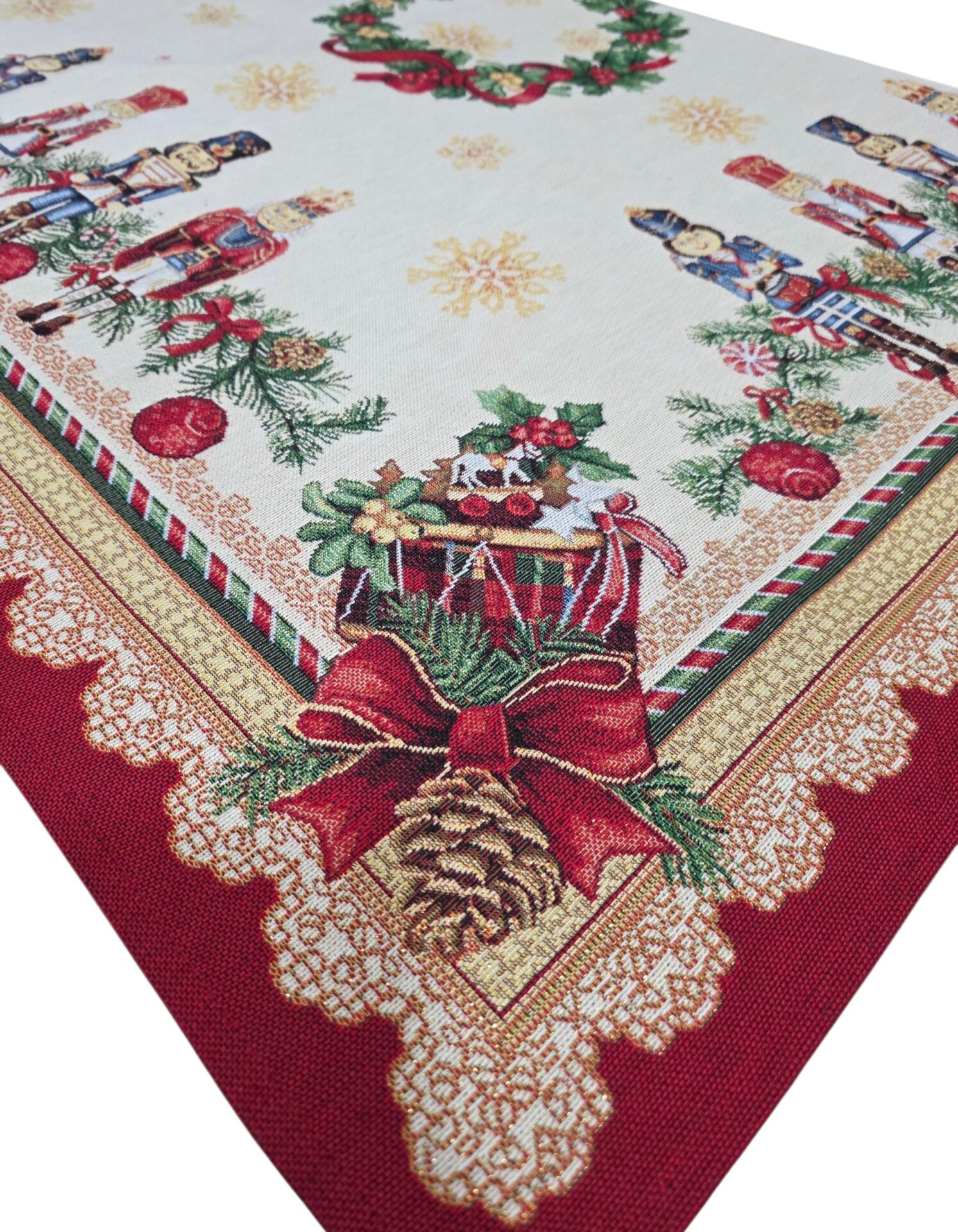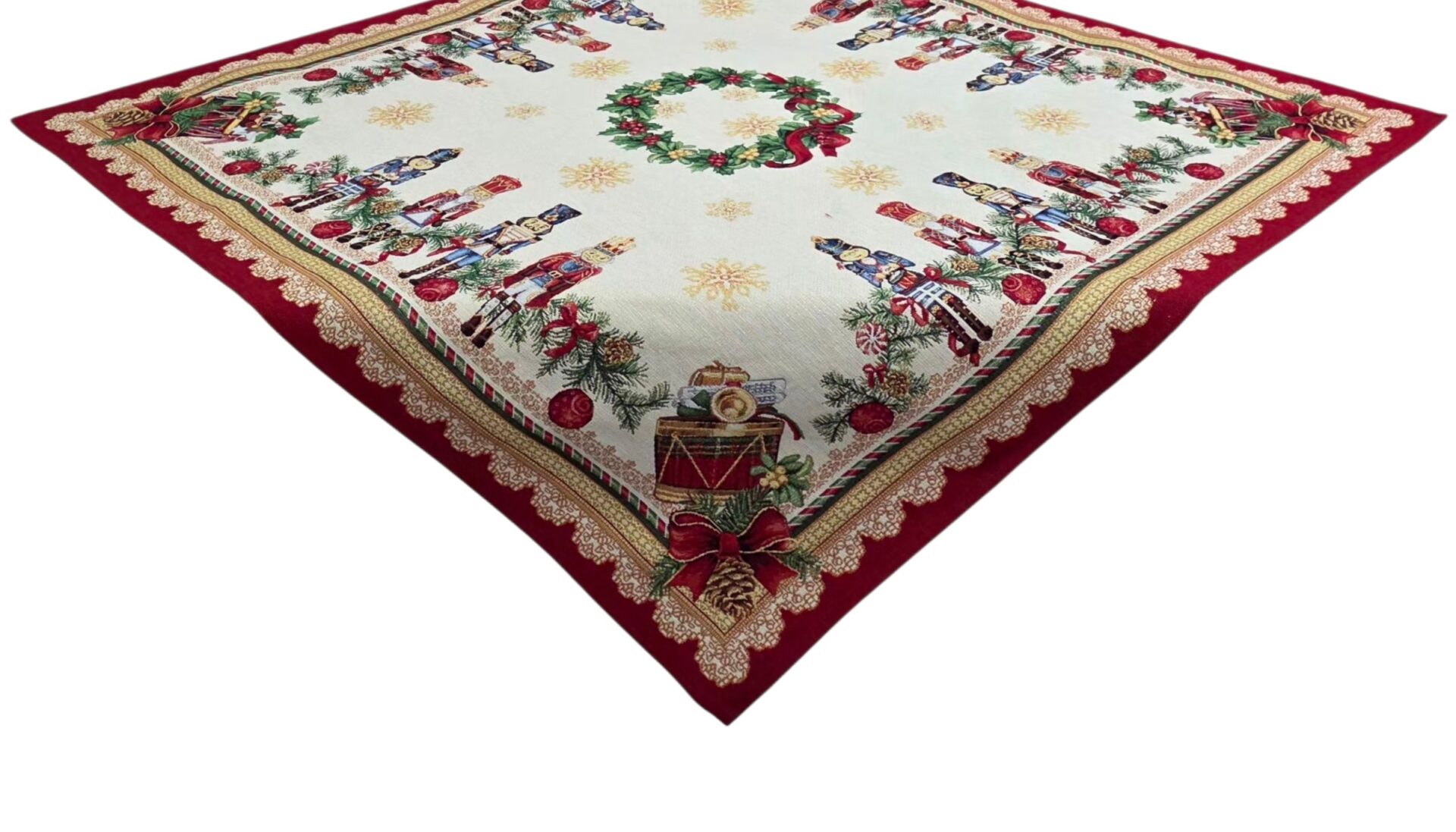 Trasforma la tua tavola natalizia con questo magnifico centrotavola in stile Gobelin, un’opera d’arte tessile che cattura perfettamente la magia del Natale. Con le sue dimensioni generose di 100x100cm, questo elegante centrotavola presenta un affascinante motivo ispirato allo Schiaccianoci, con deliziosi soldatini che decorano il bordo. Il design include una splendida ghirlanda centrale, decorazioni natalizie tradizionali e dettagli in lurex che aggiungono un tocco di brillantezza festiva. Il bordo rosso è impreziosito da un raffinato motivo di pizzo, mentre gli angoli sono decorati con fiocchi rossi e pigne. I colori predominanti – il verde, il rosso e il bianco – si fondono armoniosamente creando un’atmosfera natalizia classica e accogliente. Il tessuto Gobelin garantisce resistenza e qualità, rendendo questo centrotavola un elemento decorativo perfetto per le festività e un prezioso complemento d’arredo che può essere tramandato di generazione in generazione.
