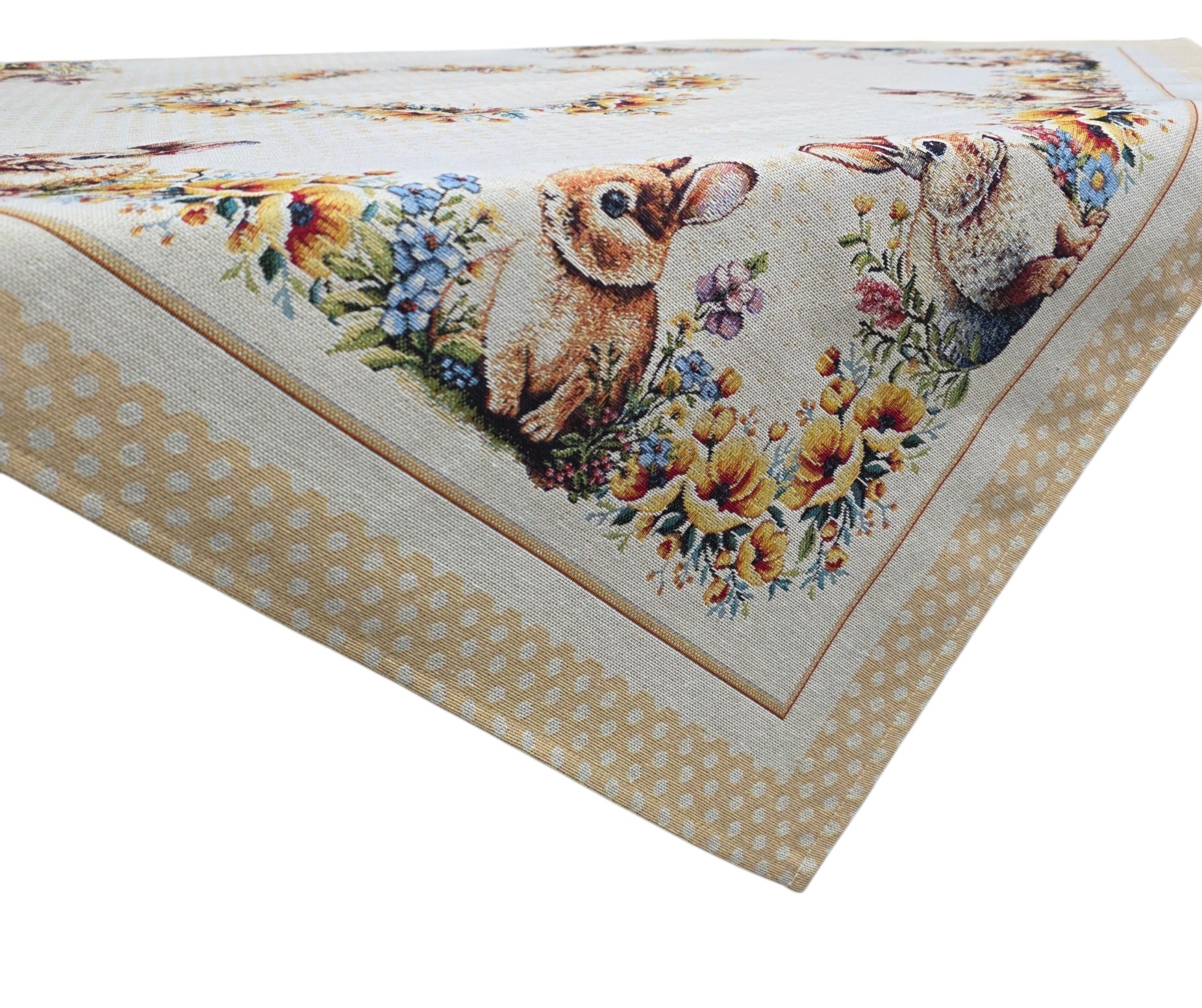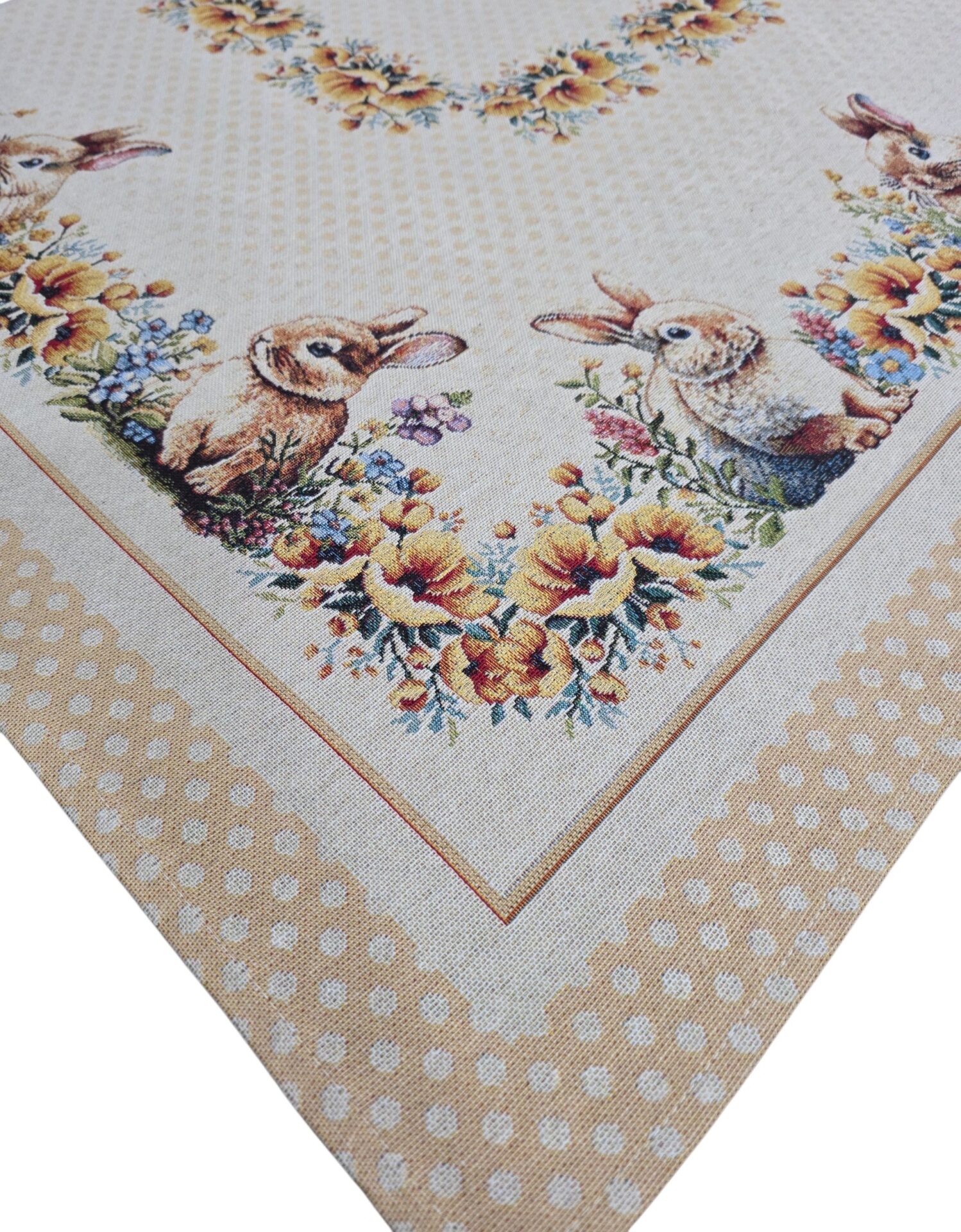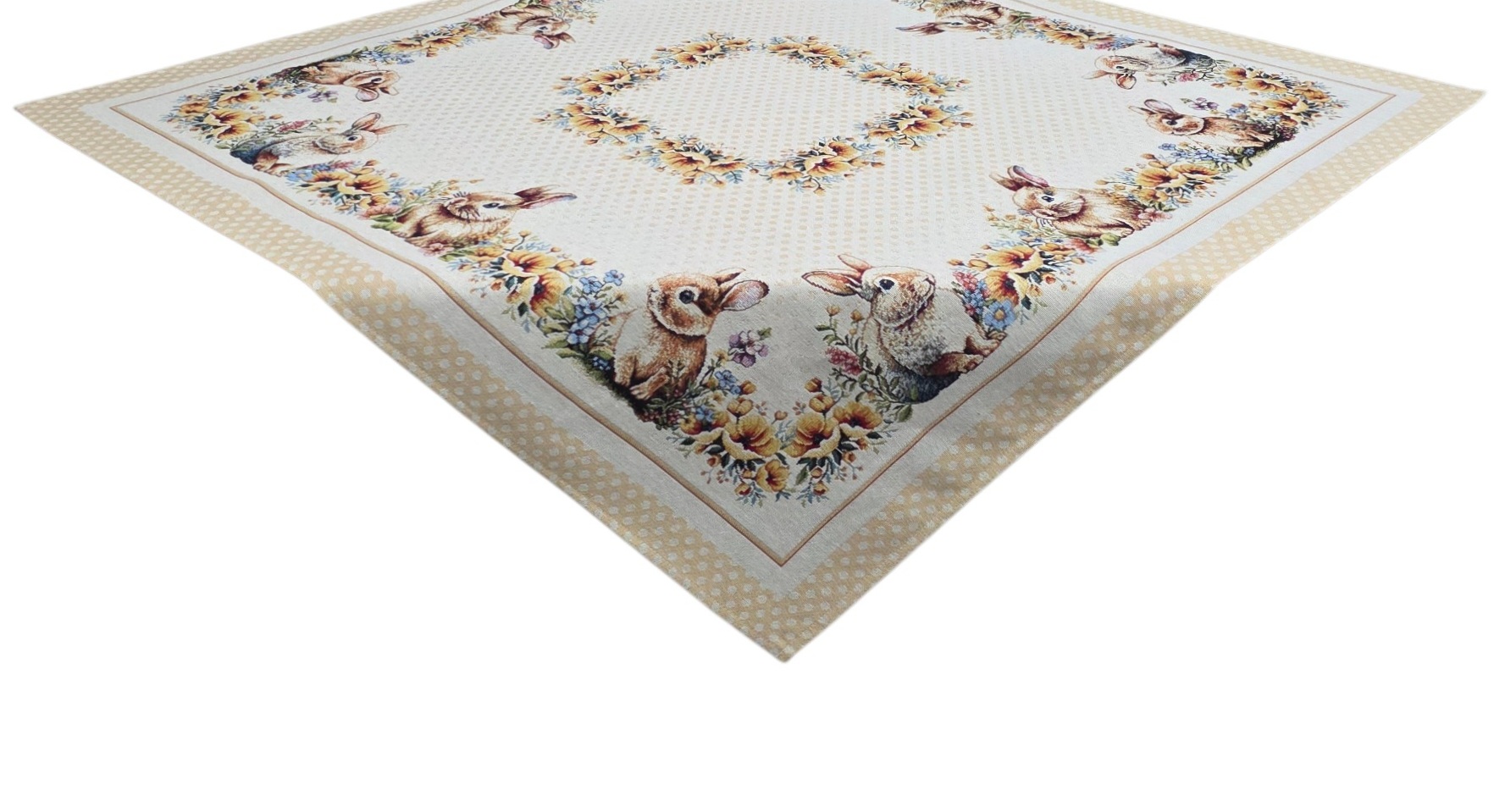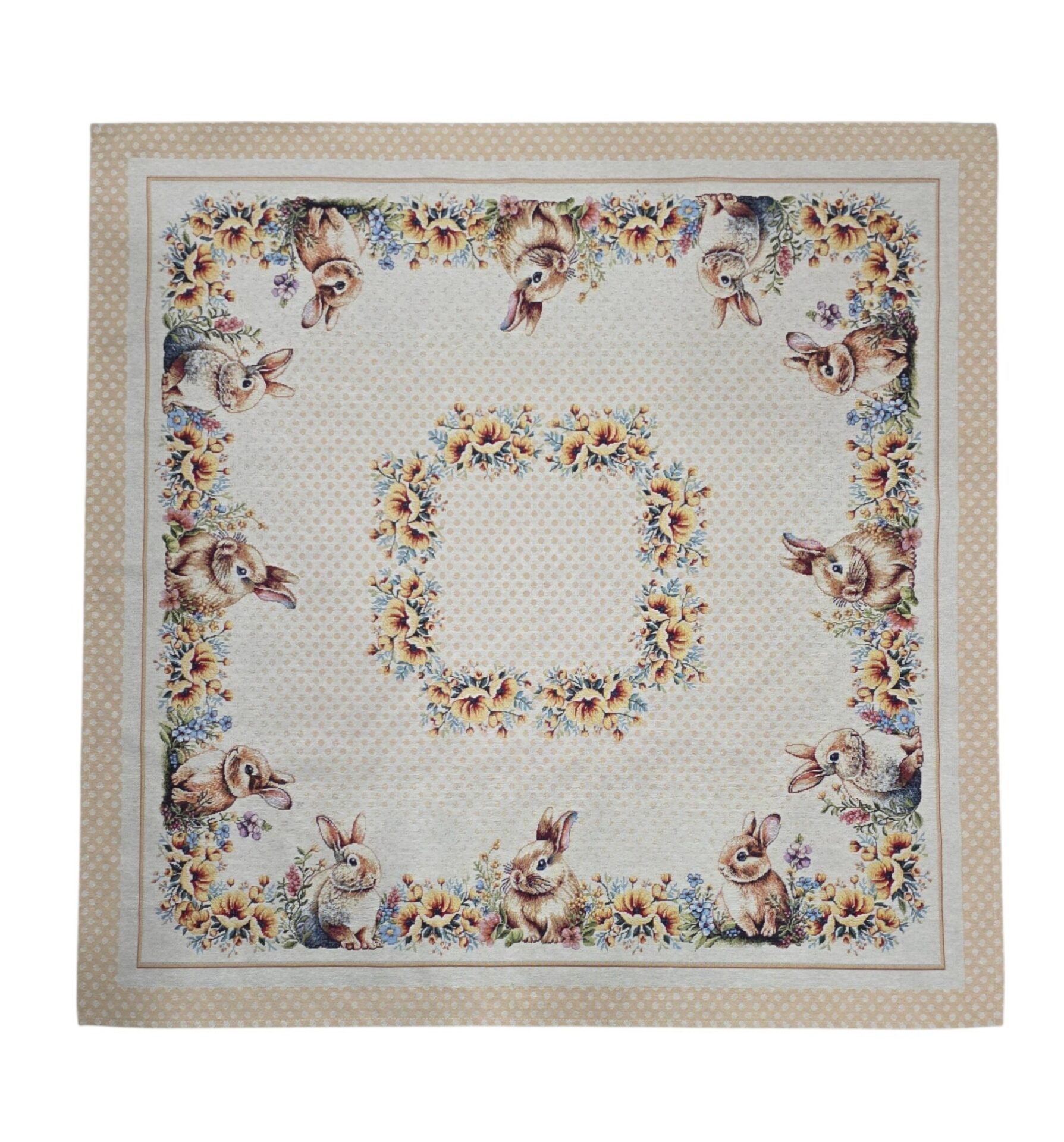 Questo elegante centrotavola pasquale in gobelin porta un tocco di primavera e festività alla vostra casa. Con le sue dimensioni generose di 100×100 cm, è perfetto per decorare tavoli da pranzo, credenze o tavolini durante le celebrazioni pasquali. Il design incantevole presenta adorabili conigli immersi in un prato fiorito, circondati da ghirlande floreali con fiori gialli, blu e rosa che creano una composizione armoniosa e primaverile. Il bordo a pois beige aggiunge un tocco delicato e raffinato all’insieme. Realizzato in gobelin, questo centrotavola offre una texture ricca e una qualità duratura che resisterà nel tempo. I dettagli intricati dei conigli, dei fiori e delle decorazioni pasquali sono resi con precisione, creando un pezzo decorativo che cattura l’essenza della stagione. Ideale per chi desidera creare un’atmosfera accogliente e festosa durante la Pasqua, questo centrotavola si abbina facilmente a diversi stili di arredamento. Perfetto anche come regalo per amici e familiari che amano decorare la casa per le festività primaverili.