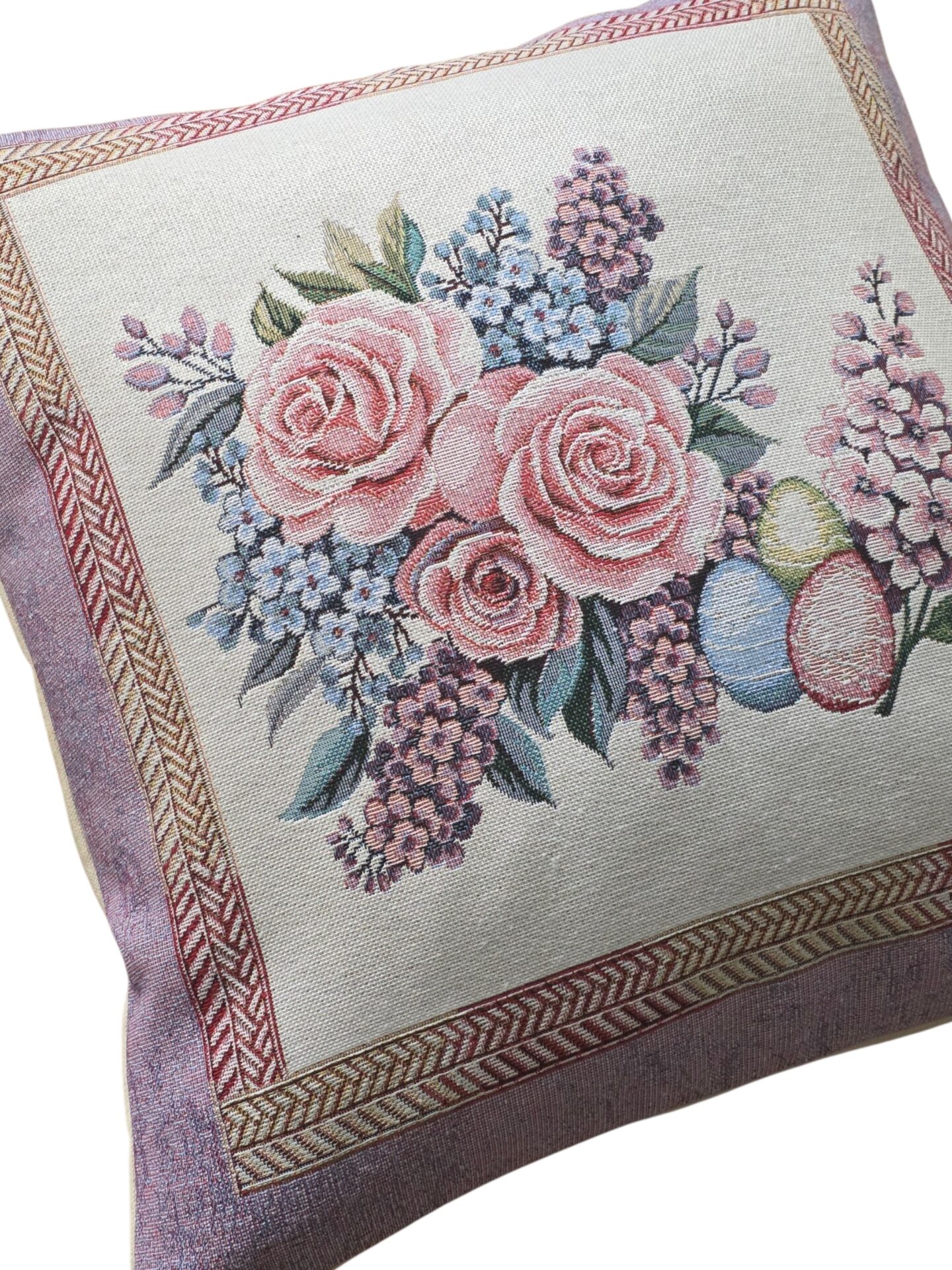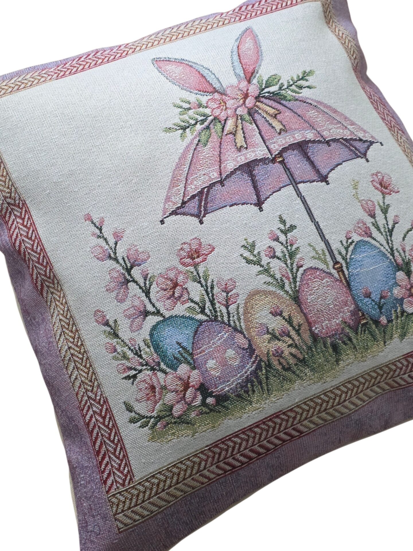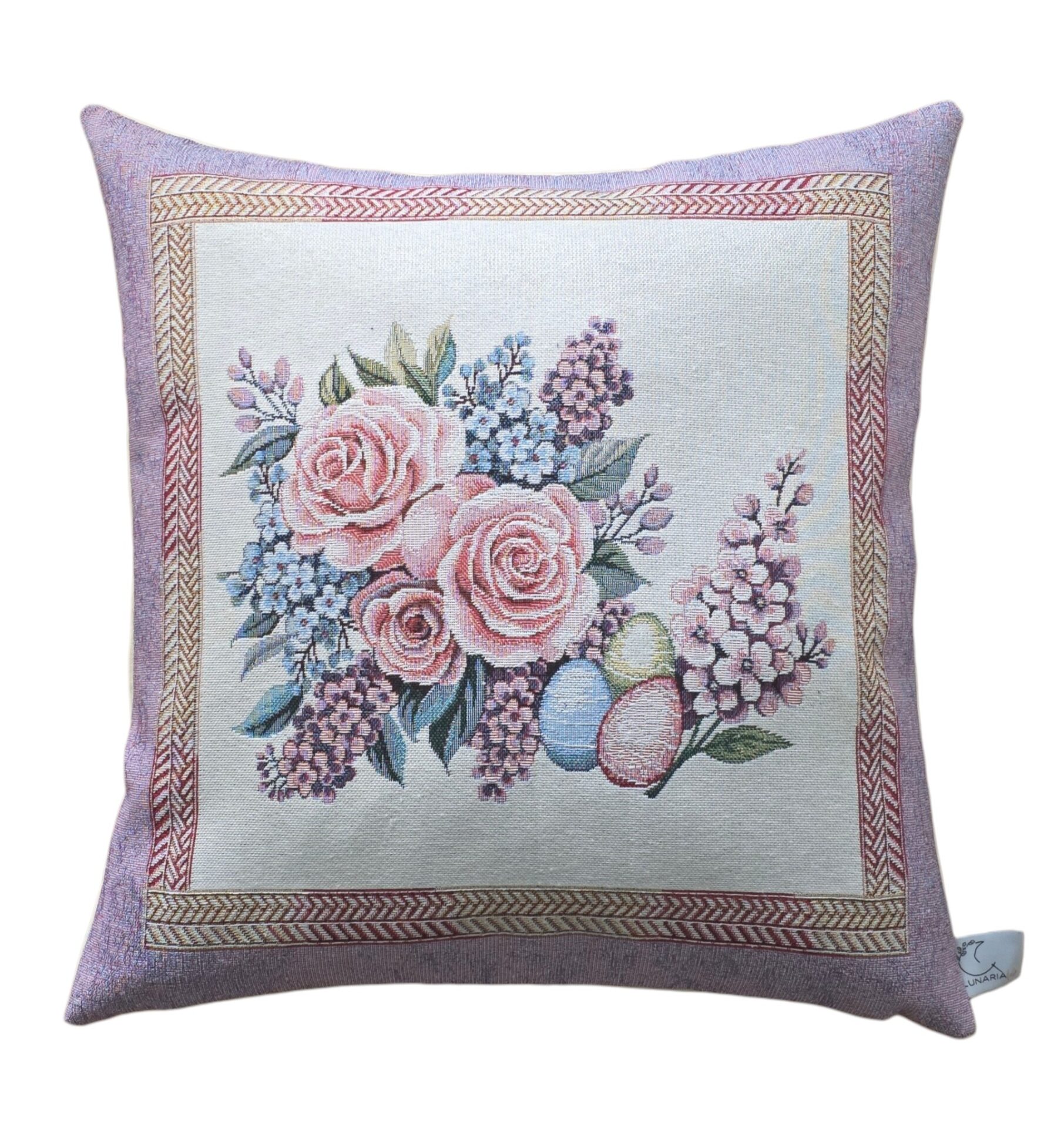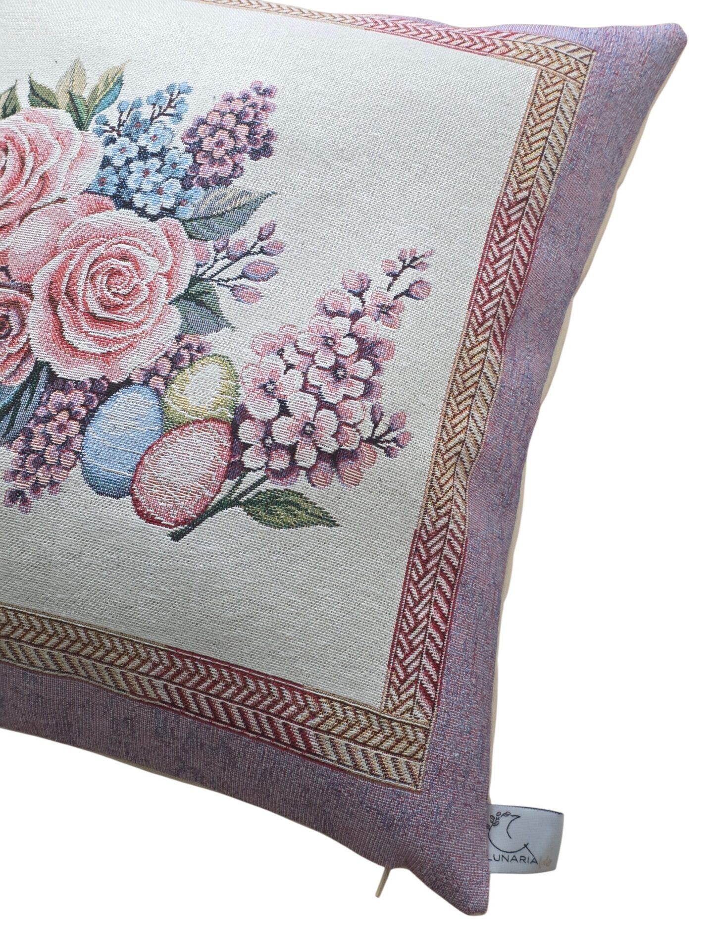 Questa elegante federa per cuscino a tema pasquale porta un tocco di primavera e festività nella vostra casa. Realizzata in pregiato tessuto gobelin, presenta splendide decorazioni ricamate che raffigurano un adorabile coniglietto pasquale, uova colorate nei toni pastello, delicate rose, fiori primaverili e farfalle. Il design è incorniciato da un raffinato bordo lilla che completa perfettamente la palette di colori tenui e romantici. Con le sue dimensioni di 45×45 cm, questa federa si adatta perfettamente ai cuscini standard ed è ideale per decorare divani, poltrone o per creare una suggestiva decorazione tavola durante le festività pasquali. Il tessuto gobelin garantisce durabilità e un aspetto ricco e strutturato che valorizza ogni dettaglio del motivo decorativo. Perfetta per chi desidera rinnovare l’arredamento di casa con un tocco stagionale elegante e festoso, questa federa trasforma qualsiasi ambiente in uno spazio accogliente e primaverile.