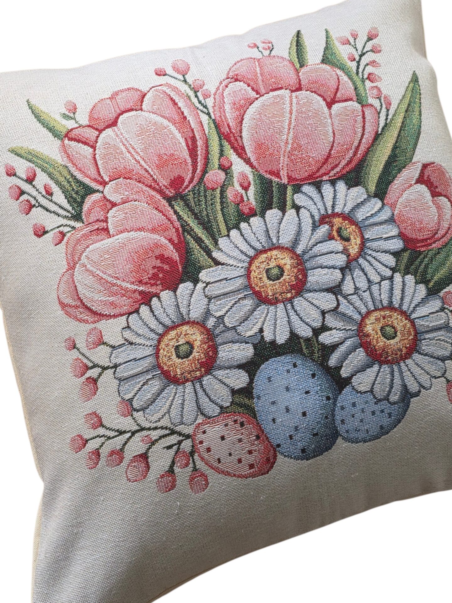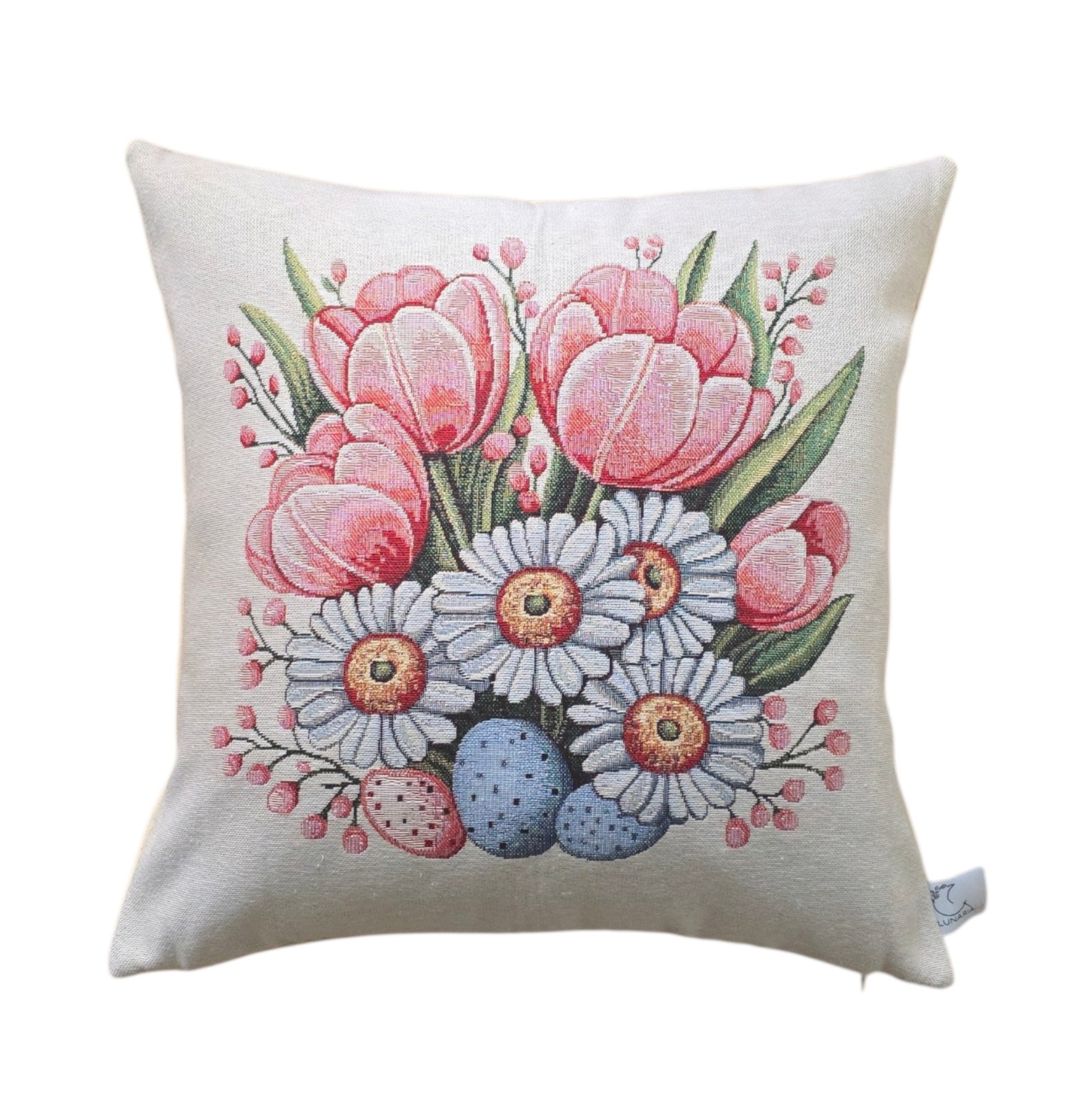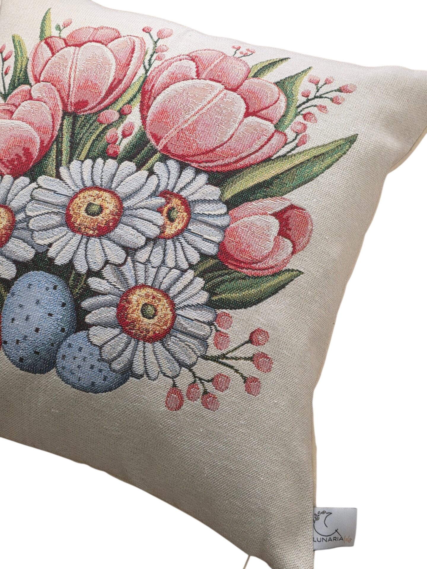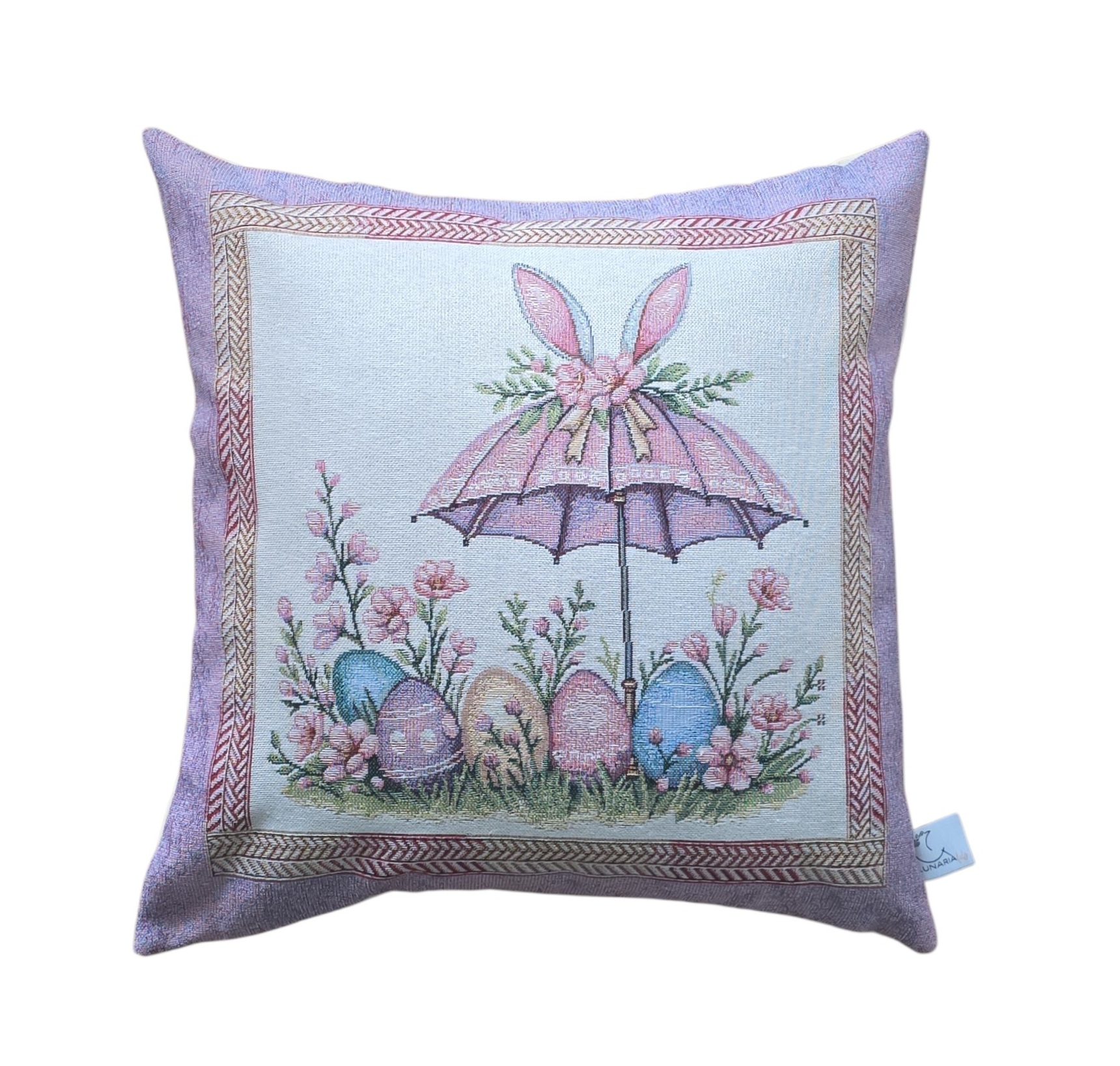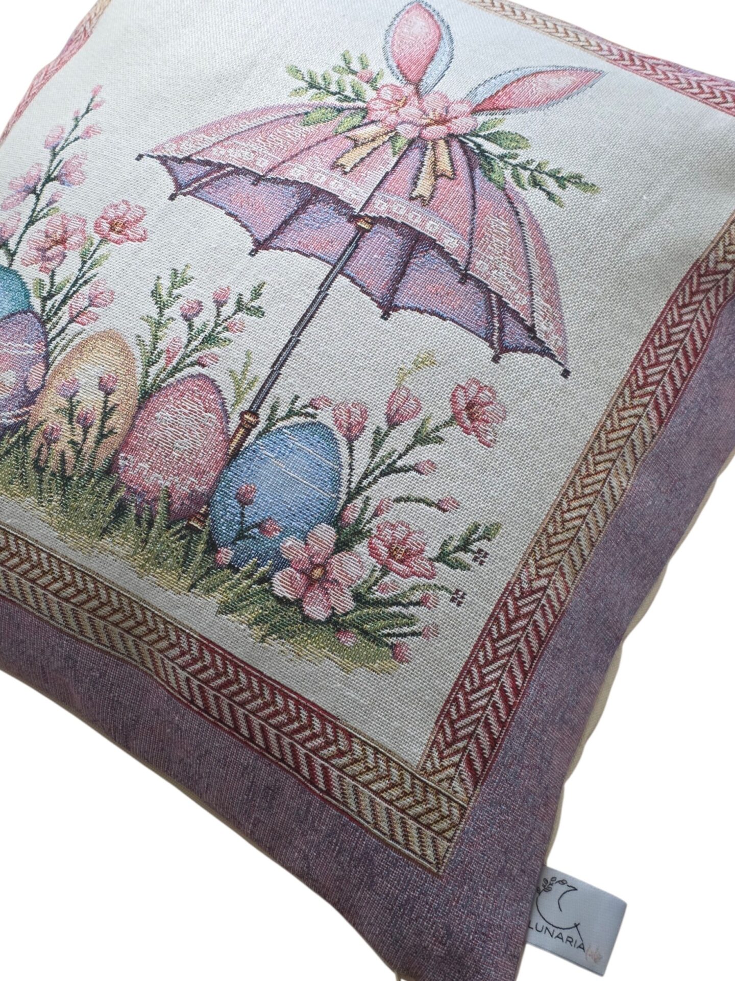 Questa elegante federa per cuscino a tema pasquale porta un tocco di primavera e festività nella vostra casa. Realizzata in pregiato tessuto gobelin, presenta splendide decorazioni ricamate che raffigurano un adorabile coniglietto pasquale, uova colorate nei toni pastello, delicate rose, fiori primaverili e farfalle. Il design è incorniciato da un raffinato bordo lilla che completa perfettamente la palette di colori tenui e romantici. Con le sue dimensioni di 45×45 cm, questa federa si adatta perfettamente ai cuscini standard ed è ideale per decorare divani, poltrone o per creare una suggestiva decorazione tavola durante le festività pasquali. Il tessuto gobelin garantisce durabilità e un aspetto ricco e strutturato che valorizza ogni dettaglio del motivo decorativo. Perfetta per chi desidera rinnovare l’arredamento di casa con un tocco stagionale elegante e festoso, questa federa trasforma qualsiasi ambiente in uno spazio accogliente e primaverile.