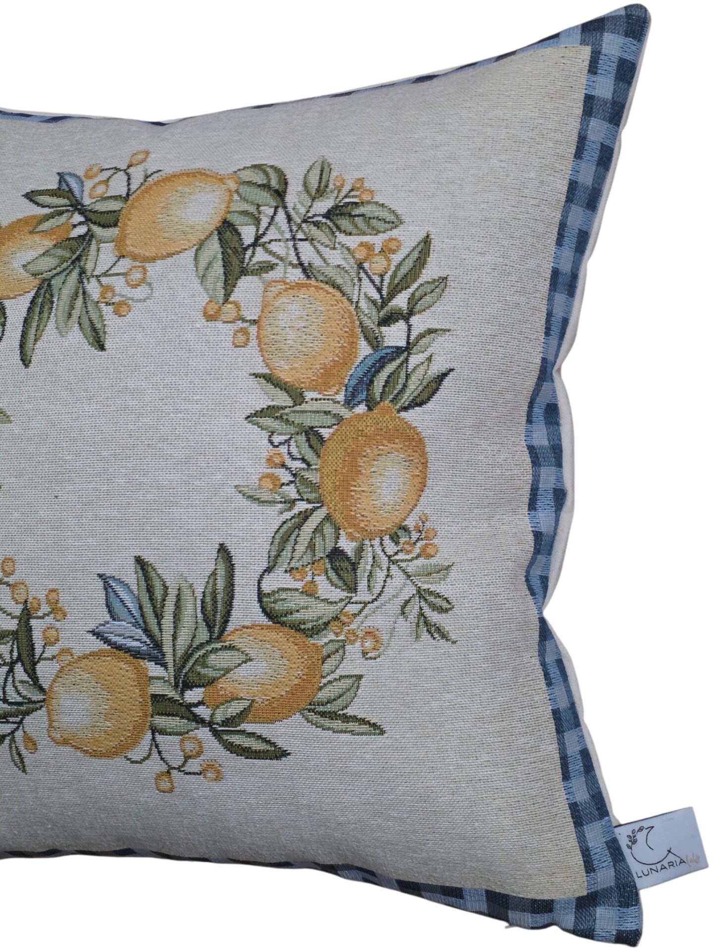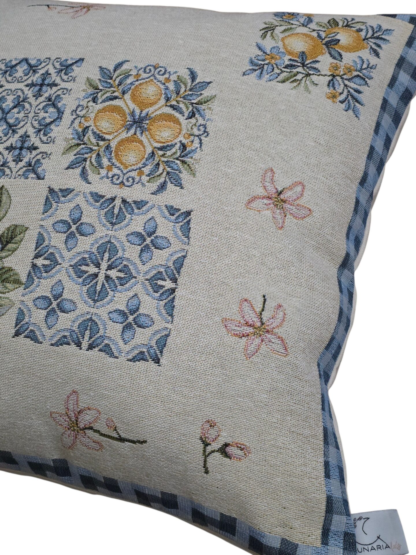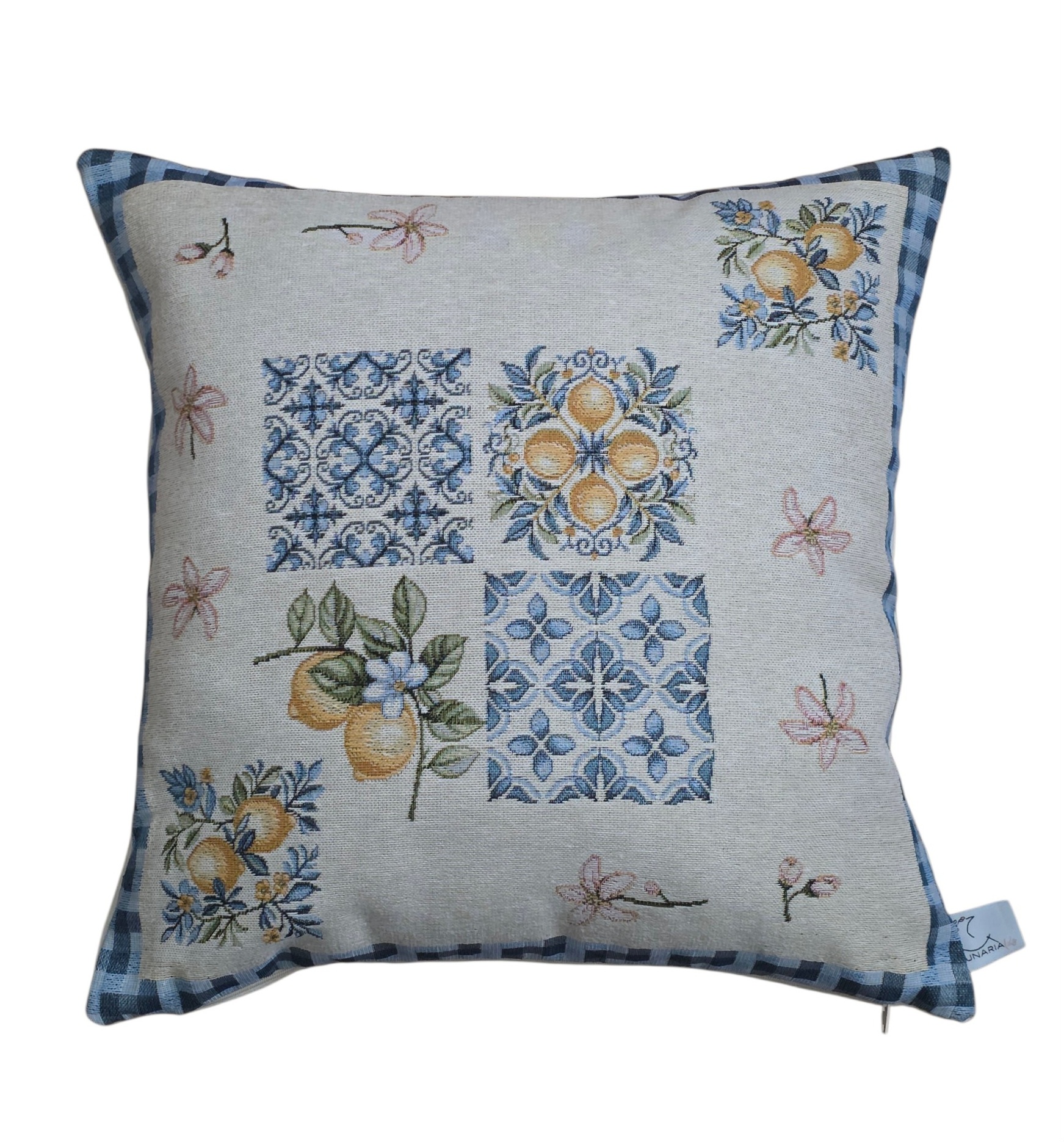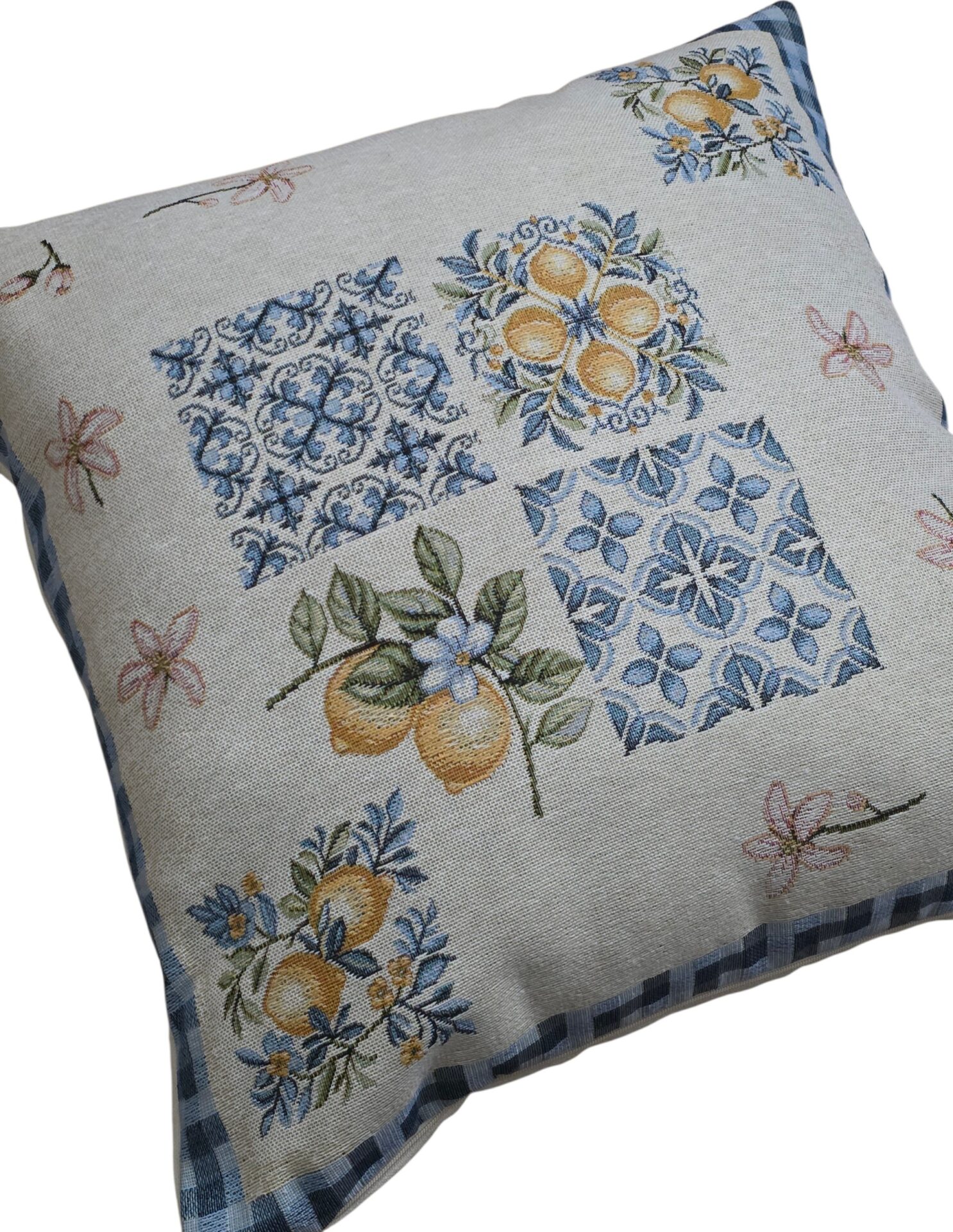 Queste eleganti federe per cuscini decorativi portano il calore e il fascino del Mediterraneo direttamente nella vostra casa. Realizzate in pregiato tessuto gobelin, presentano tre splendidi motivi ispirati alla tradizione italiana: una ghirlanda di limoni con foglie verdi e delicati fiori bianchi, un cesto decorativo ricolmo di limoni dorati, e un raffinato design a mosaico che combina piastrelle ceramiche blu con composizioni di agrumi. Ogni federa è impreziosita da dettagli floreali delicati e rifinita con un elegante bordo gingham blu che incornicia perfettamente il design. Le dimensioni di 45×45 cm le rendono perfette per la maggior parte dei cuscini standard, ideali per divani, poltrone o letti. Questi cuscini decorativi trasformano qualsiasi ambiente con il loro stile mediterraneo senza tempo, evocando l’atmosfera delle coste soleggiate e dei giardini di limoni. Perfetti per aggiungere un tocco di colore e personalità al vostro arredamento, sia in stile classico che contemporaneo.