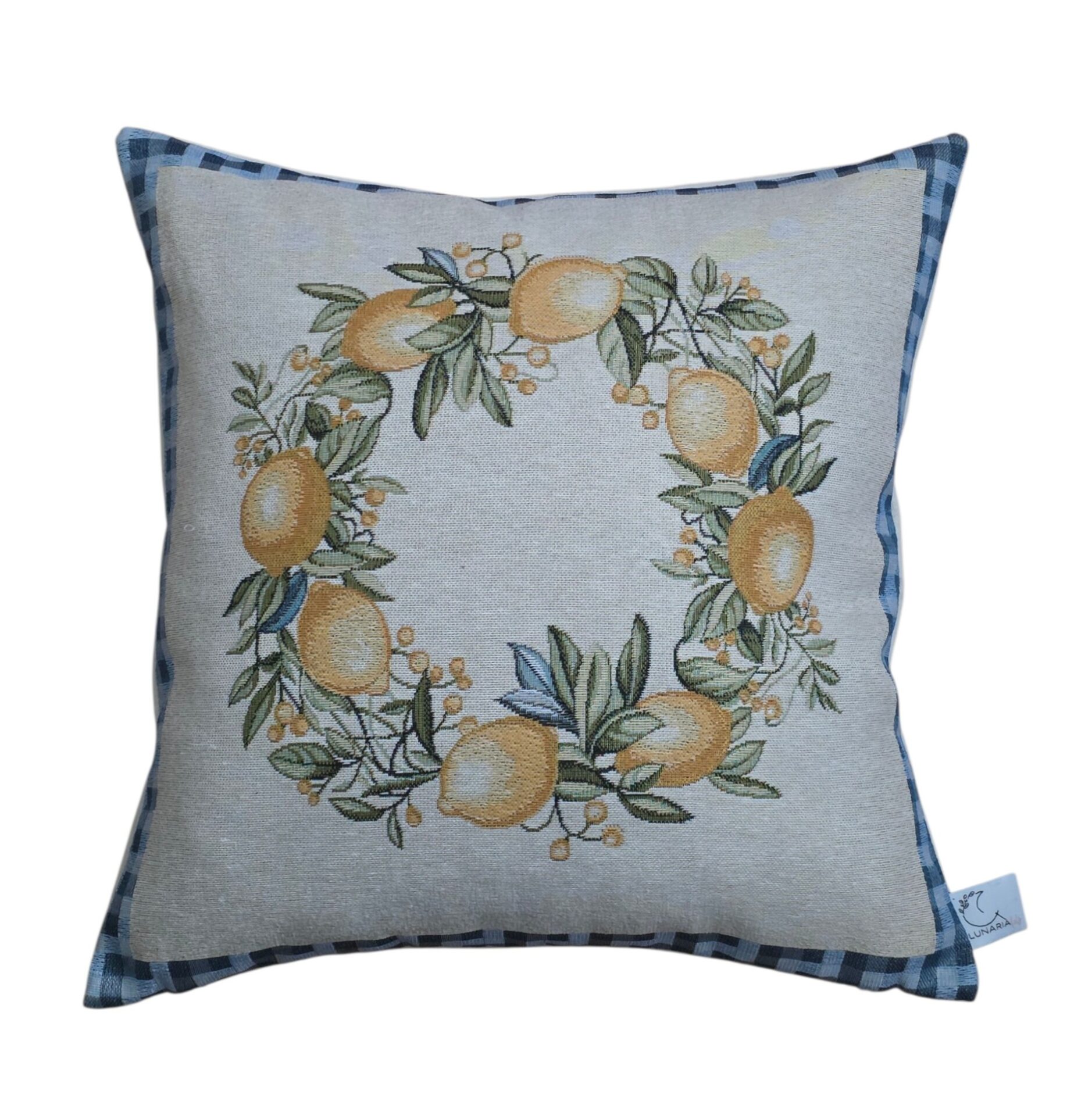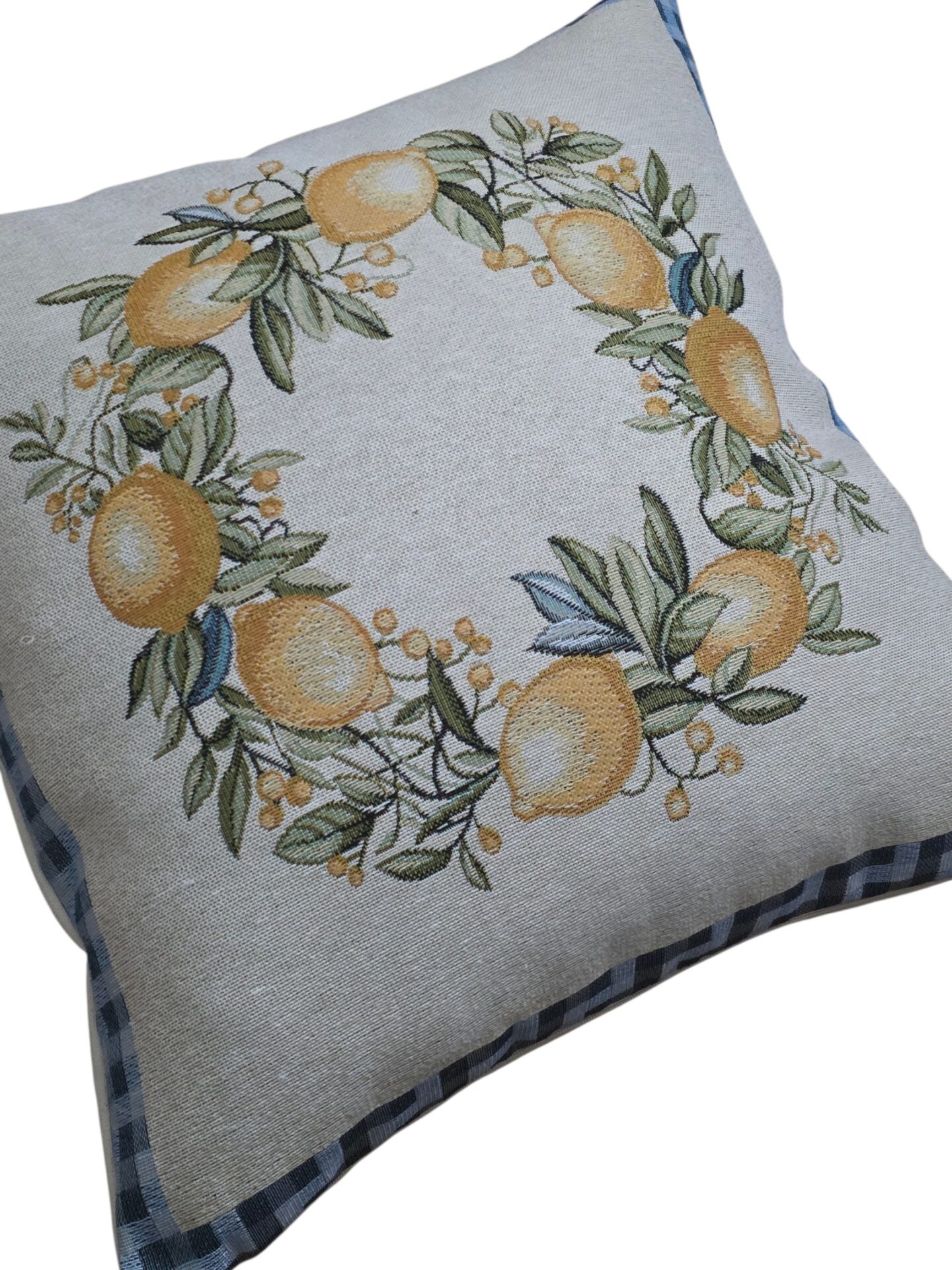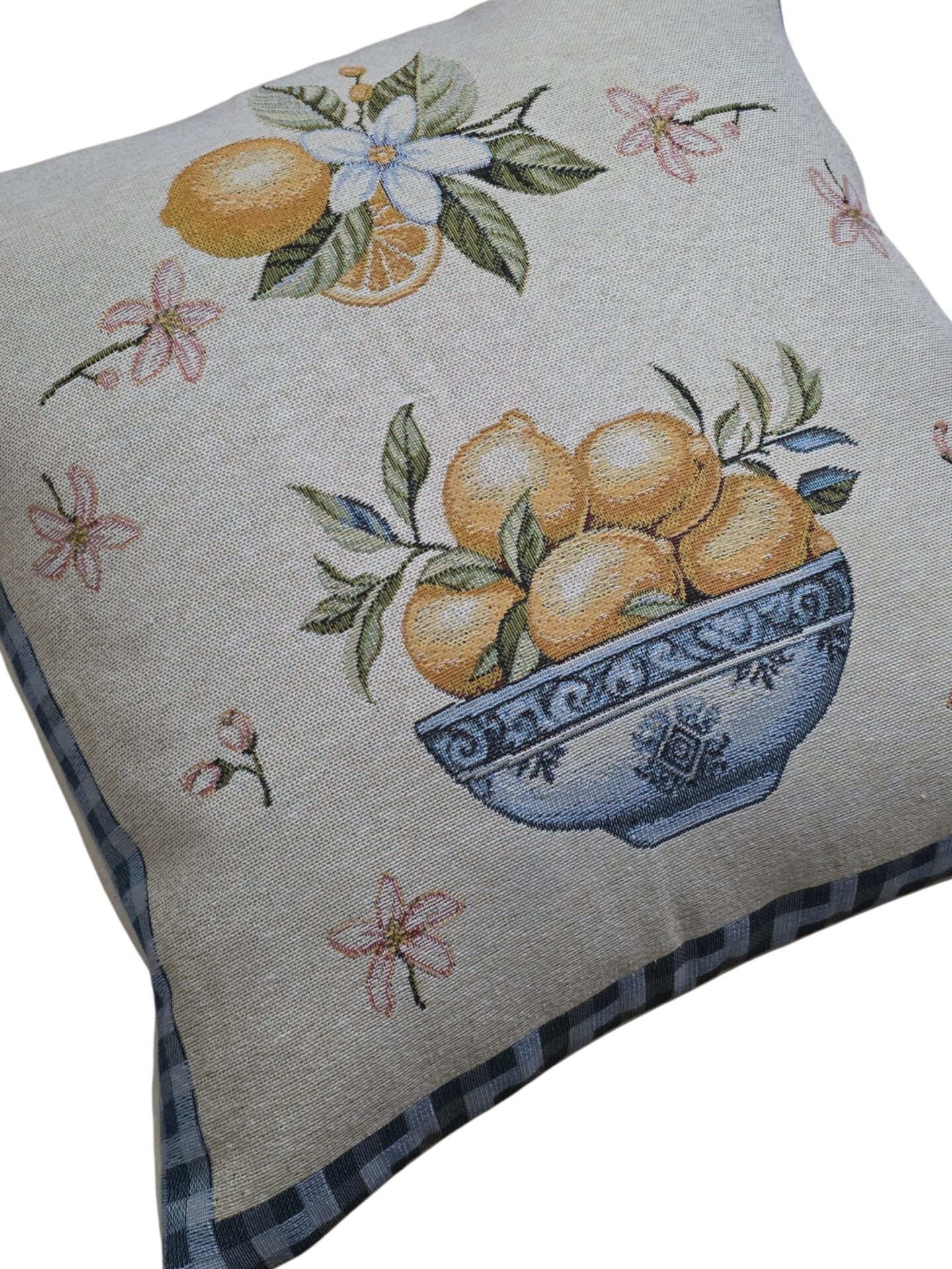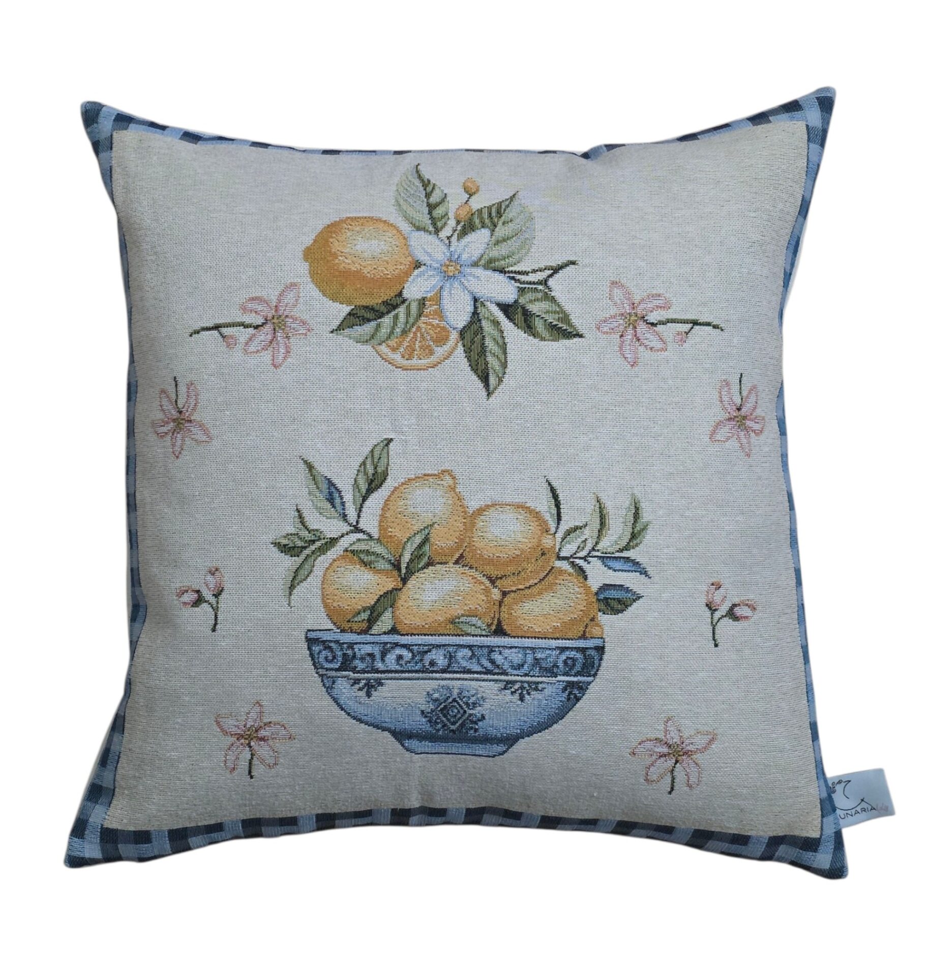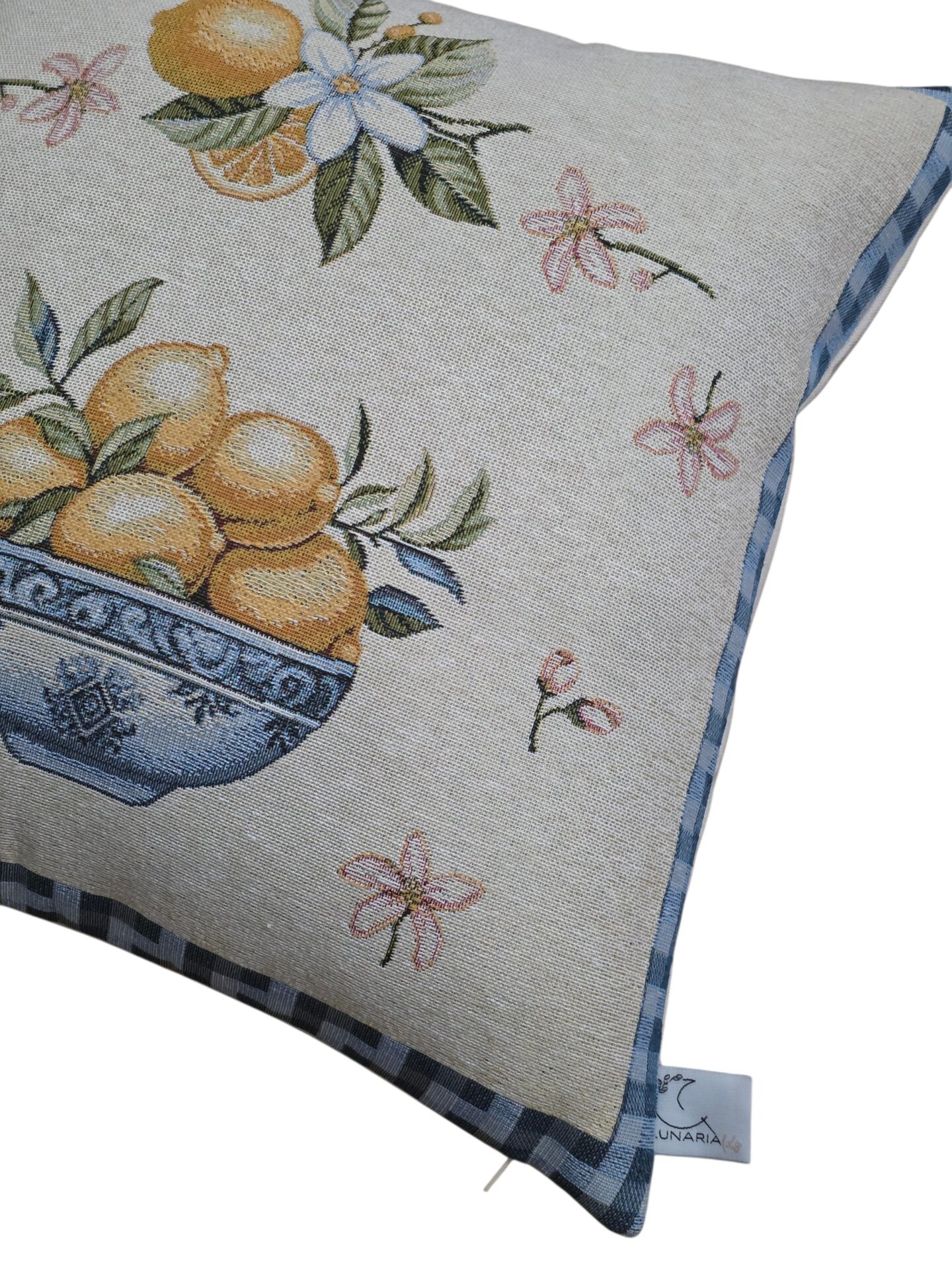 Queste eleganti federe per cuscini decorativi portano il calore e il fascino del Mediterraneo direttamente nella vostra casa. Realizzate in pregiato tessuto gobelin, presentano tre splendidi motivi ispirati alla tradizione italiana: una ghirlanda di limoni con foglie verdi e delicati fiori bianchi, un cesto decorativo ricolmo di limoni dorati, e un raffinato design a mosaico che combina piastrelle ceramiche blu con composizioni di agrumi. Ogni federa è impreziosita da dettagli floreali delicati e rifinita con un elegante bordo gingham blu che incornicia perfettamente il design. Le dimensioni di 45×45 cm le rendono perfette per la maggior parte dei cuscini standard, ideali per divani, poltrone o letti. Questi cuscini decorativi trasformano qualsiasi ambiente con il loro stile mediterraneo senza tempo, evocando l’atmosfera delle coste soleggiate e dei giardini di limoni. Perfetti per aggiungere un tocco di colore e personalità al vostro arredamento, sia in stile classico che contemporaneo.