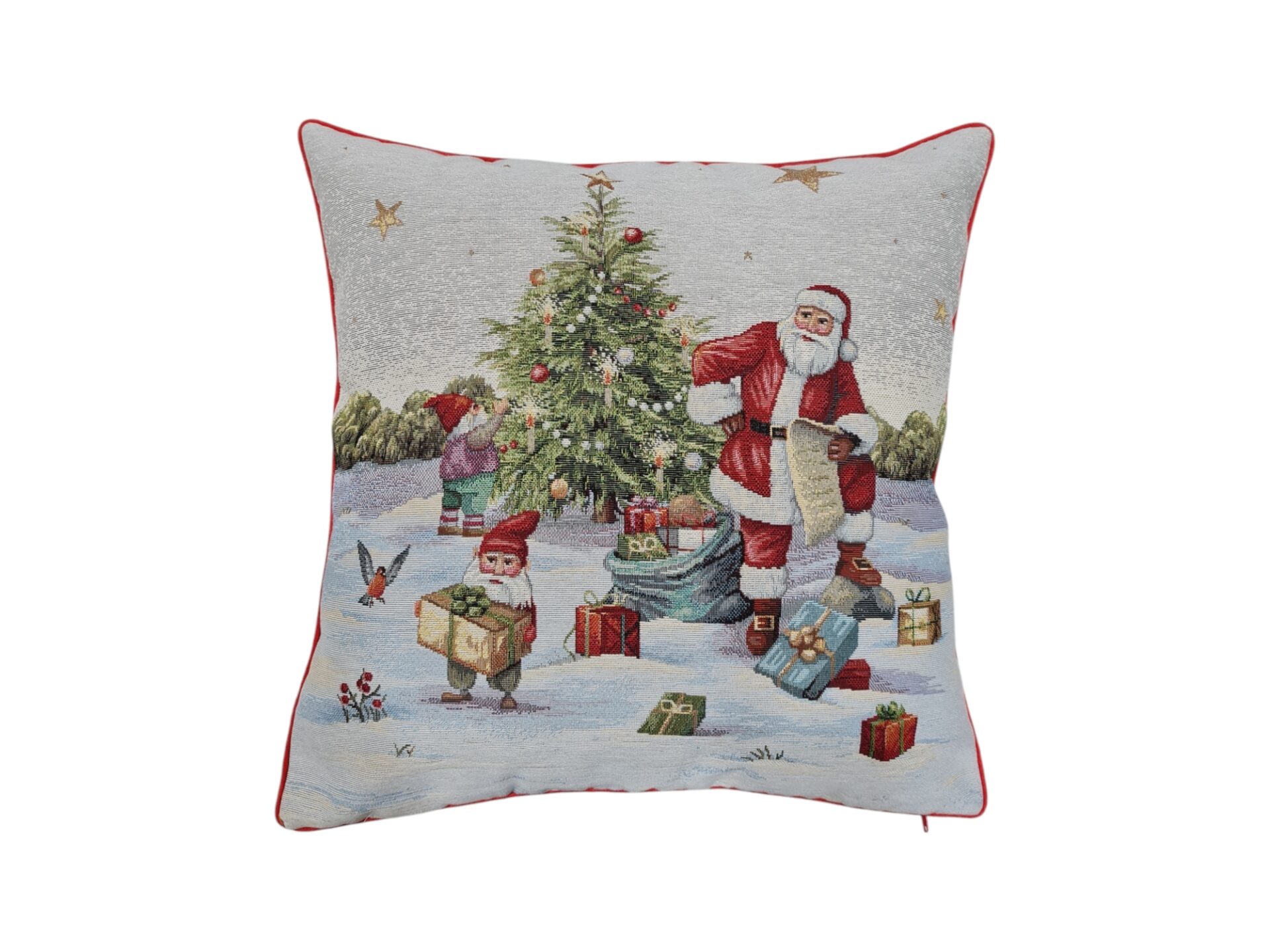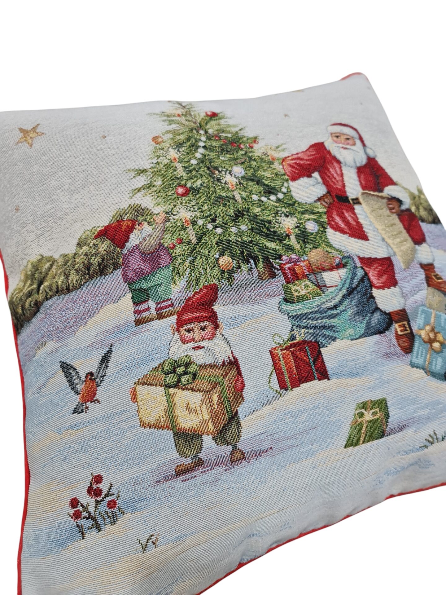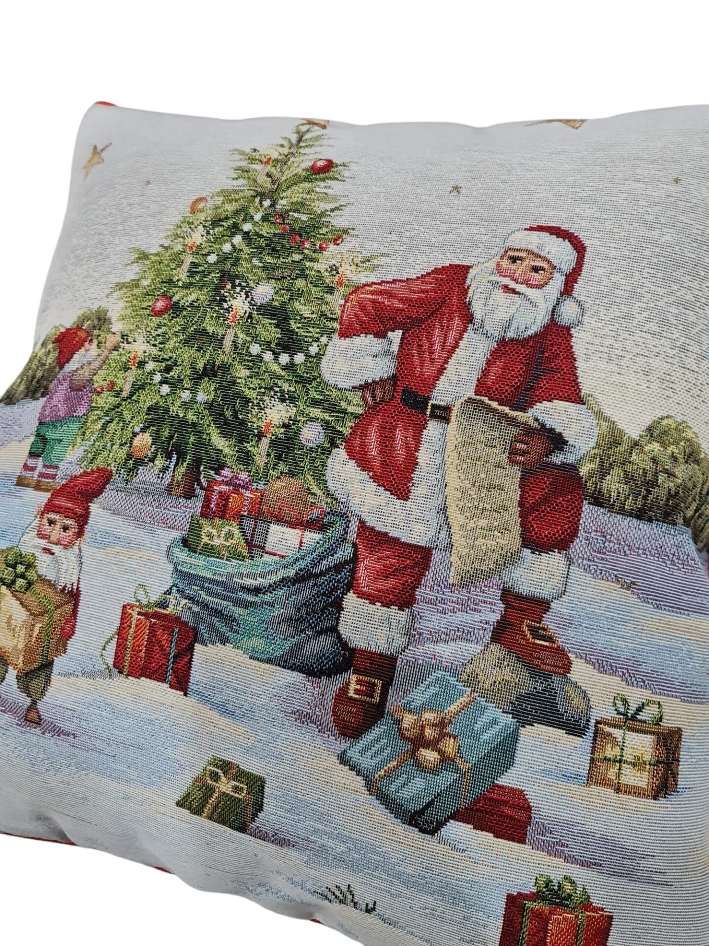 Cuscino arredo in tessuto gobelin, disegno Babbo Natale, 45×45 cm. Prodotto artigianale, interamente realizzato a mano.