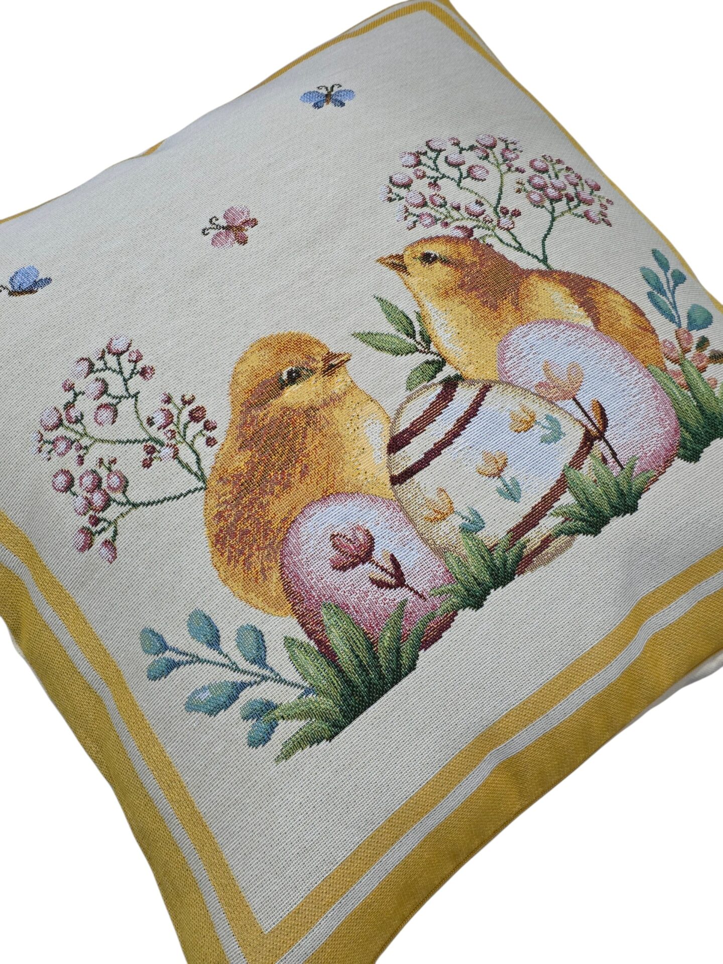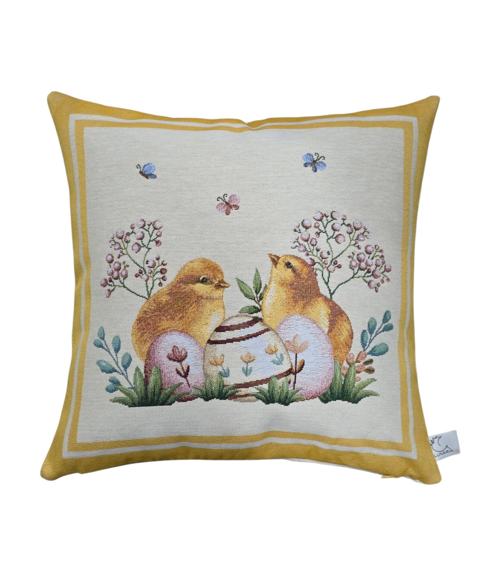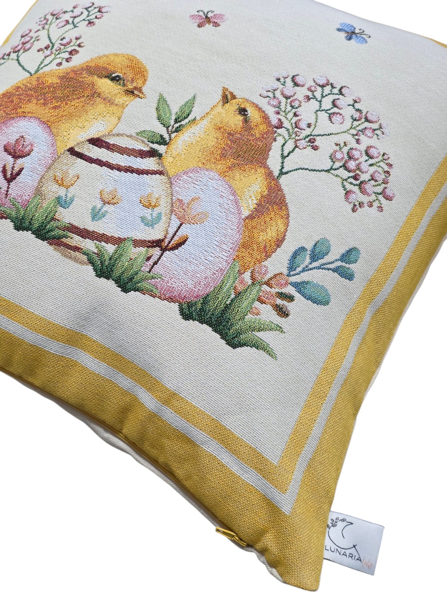 Questa elegante federa per cuscino pasquale in gobelin porta un tocco di primavera e festività nella vostra casa. Il design incantevole raffigura due adorabili pulcini dorati posati su uova pasquali decorate, circondati da delicati fiori rosa, foglie verdi e graziose farfalle che svolazzano nell’aria. La cornice gialla con bordo bianco crea un contrasto raffinato che valorizza l’intera composizione. Realizzata in tessuto gobelin di qualità, questa federa offre una texture ricca e dettagli intricati che catturano l’essenza della stagione pasquale. Con le sue dimensioni di 45×45 cm, si adatta perfettamente ai cuscini standard e può essere utilizzata su divani, poltrone o letti per creare un’atmosfera festosa e accogliente. Il design versatile con tonalità calde di giallo, crema e pastello si integra facilmente con diversi stili di arredamento. Perfetta per celebrare la Pasqua o semplicemente per aggiungere un tocco primaverile al vostro spazio abitativo durante tutta la stagione.