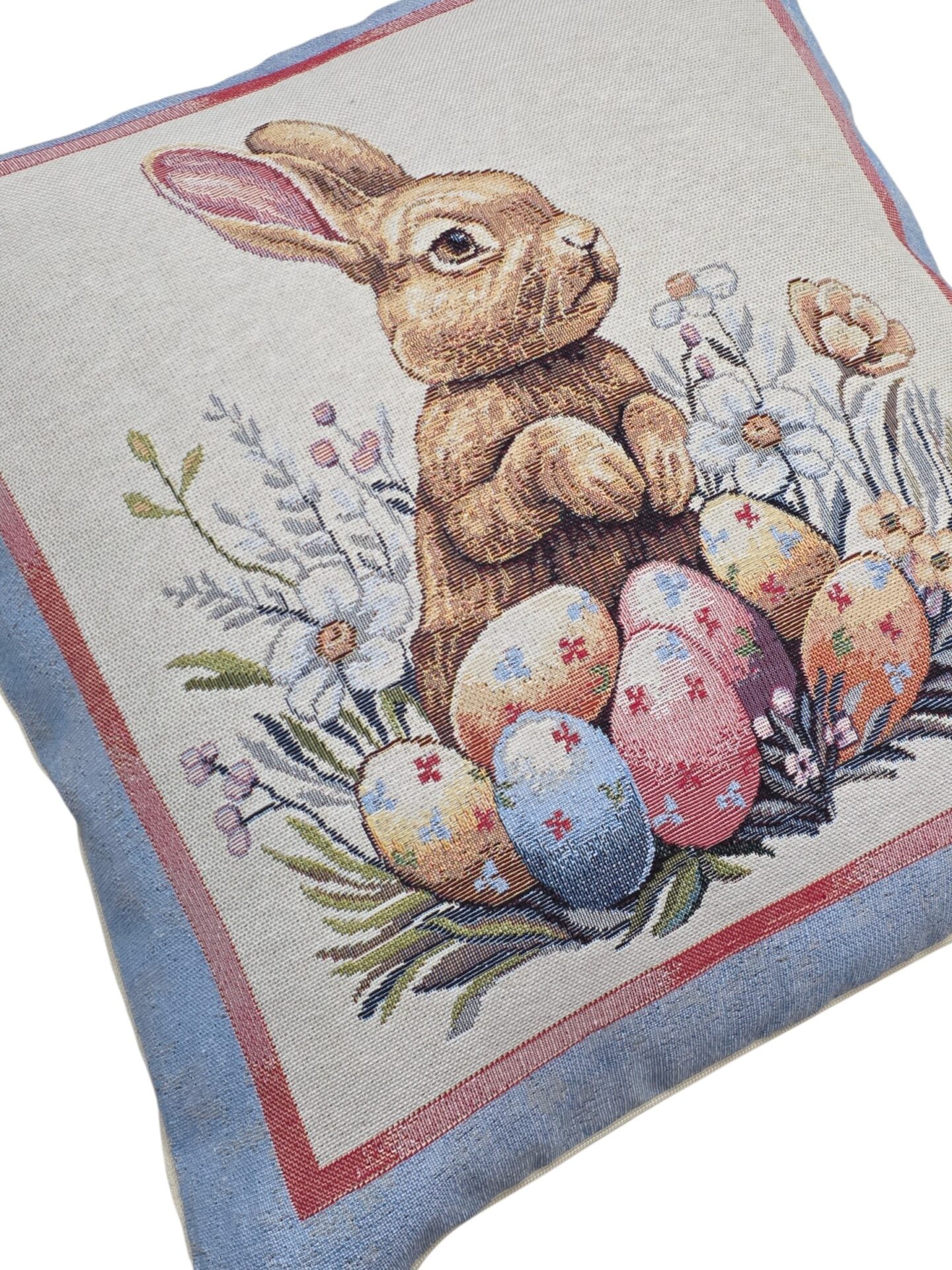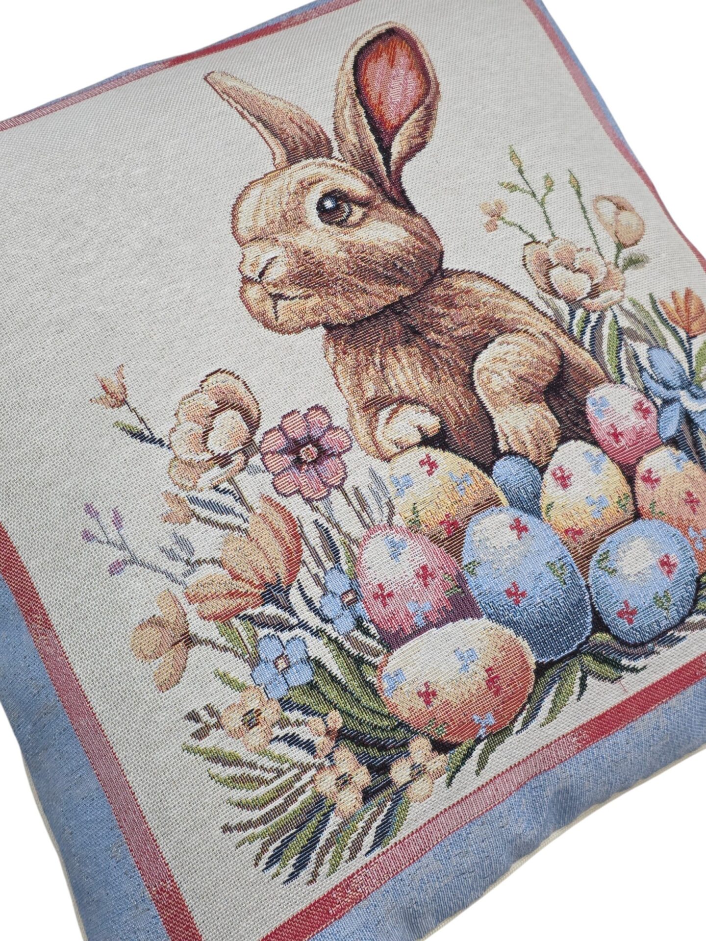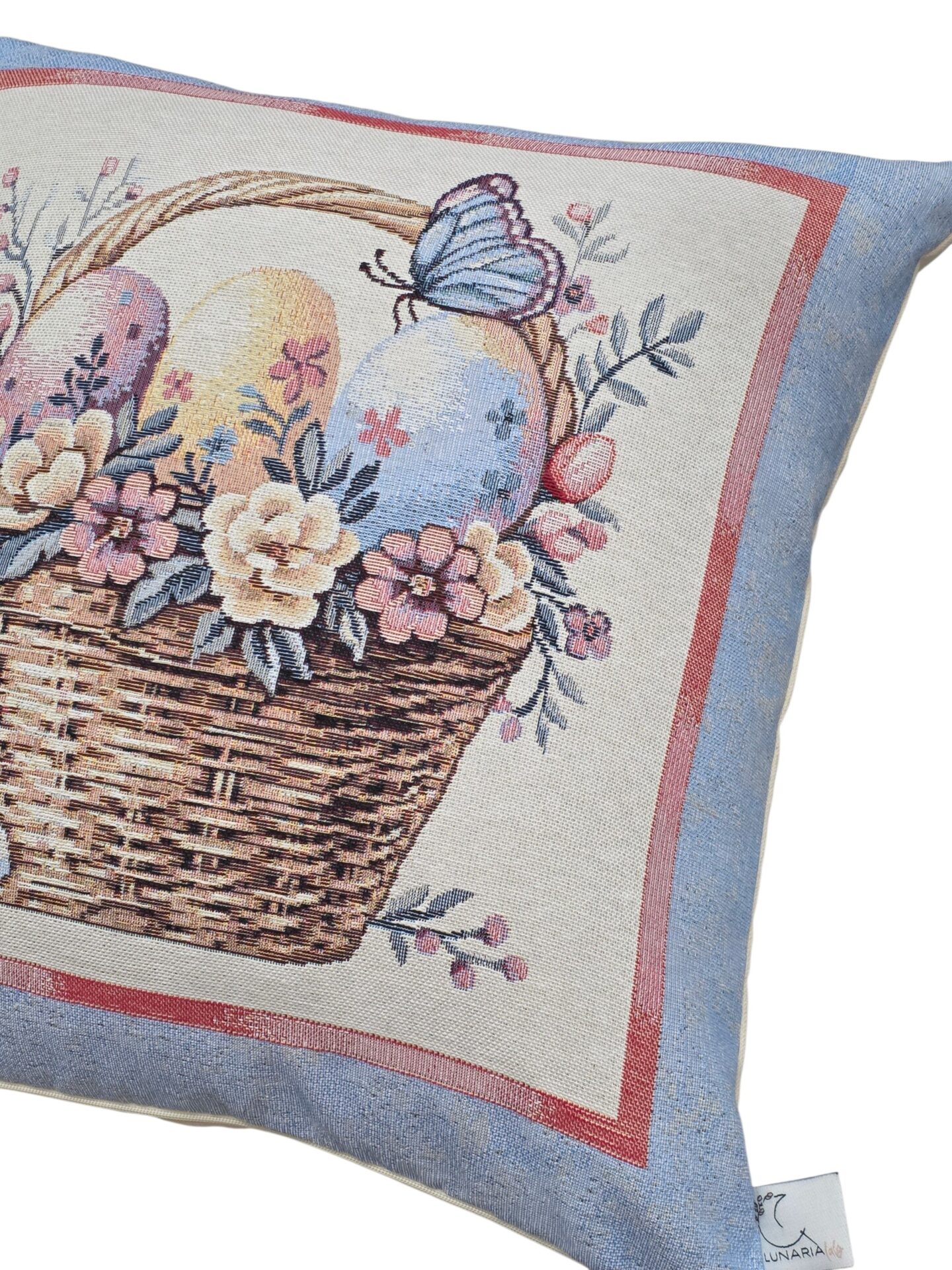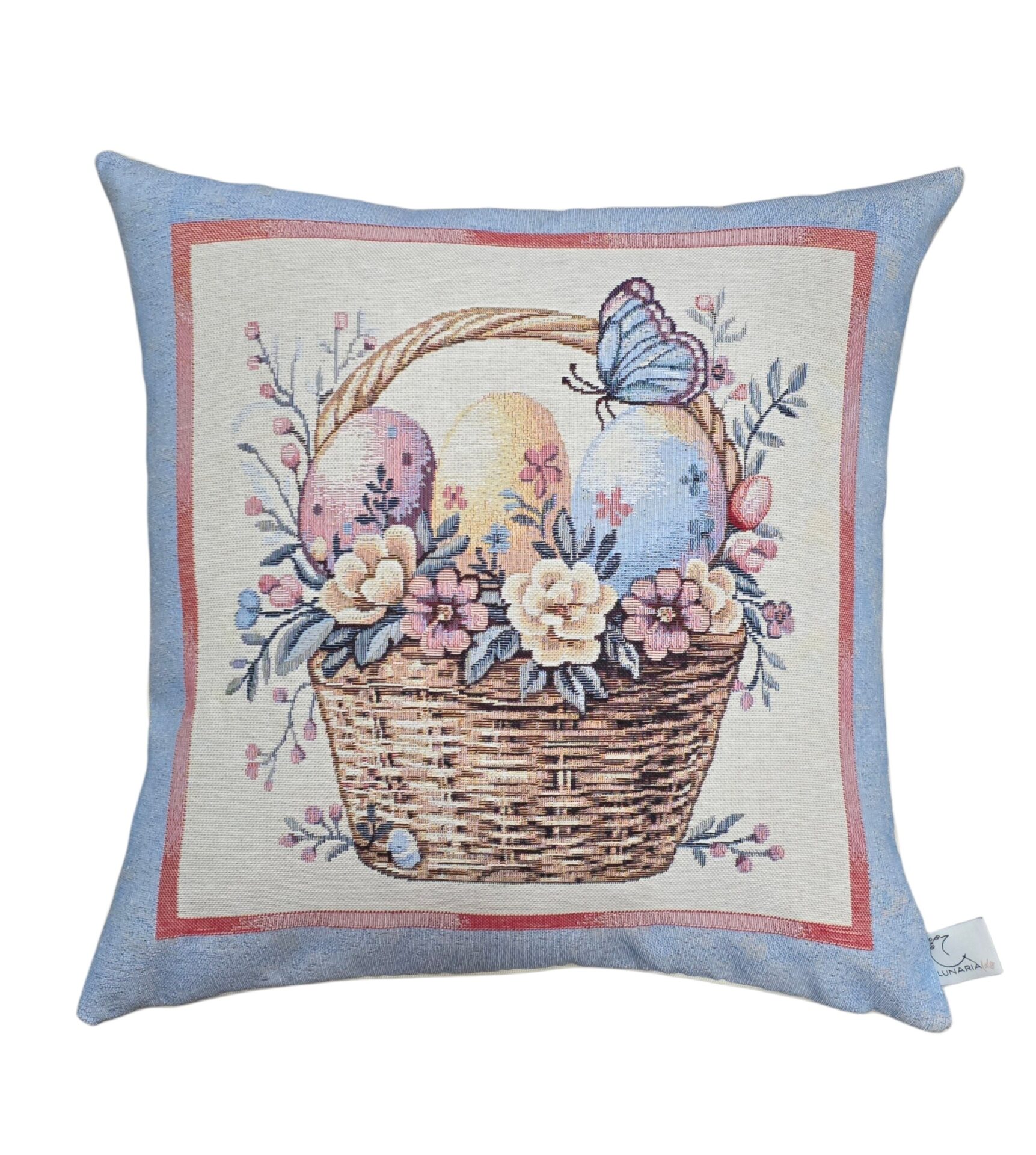 Queste eleganti federe per cuscini a tema pasquale portano un tocco di primavera e festività nella vostra casa. Realizzate in pregiato tessuto gobelin, presentano tre deliziosi motivi: un adorabile coniglietto circondato da uova colorate e fiori primaverili, un cestino intrecciato ricolmo di uova decorate con una graziosa farfalla blu, e un tenero coniglietto seduto tra uova pasquali e delicate fioriture. Ogni federa è incorniciata da un elegante bordo azzurro polvere con dettagli rosa che esalta i colori pastello delle illustrazioni. Le dimensioni di 45×45 cm le rendono perfette per la maggior parte dei cuscini standard. Queste federe sono ideali per decorare divani, poltrone o letti durante la stagione pasquale, creando un’atmosfera accogliente e festosa. Il tessuto gobelin garantisce durata e una texture ricca che aggiunge profondità visiva a qualsiasi ambiente. Perfette come decorazione per la tavola pasquale o come regalo per chi ama rinnovare la propria casa seguendo le stagioni.
