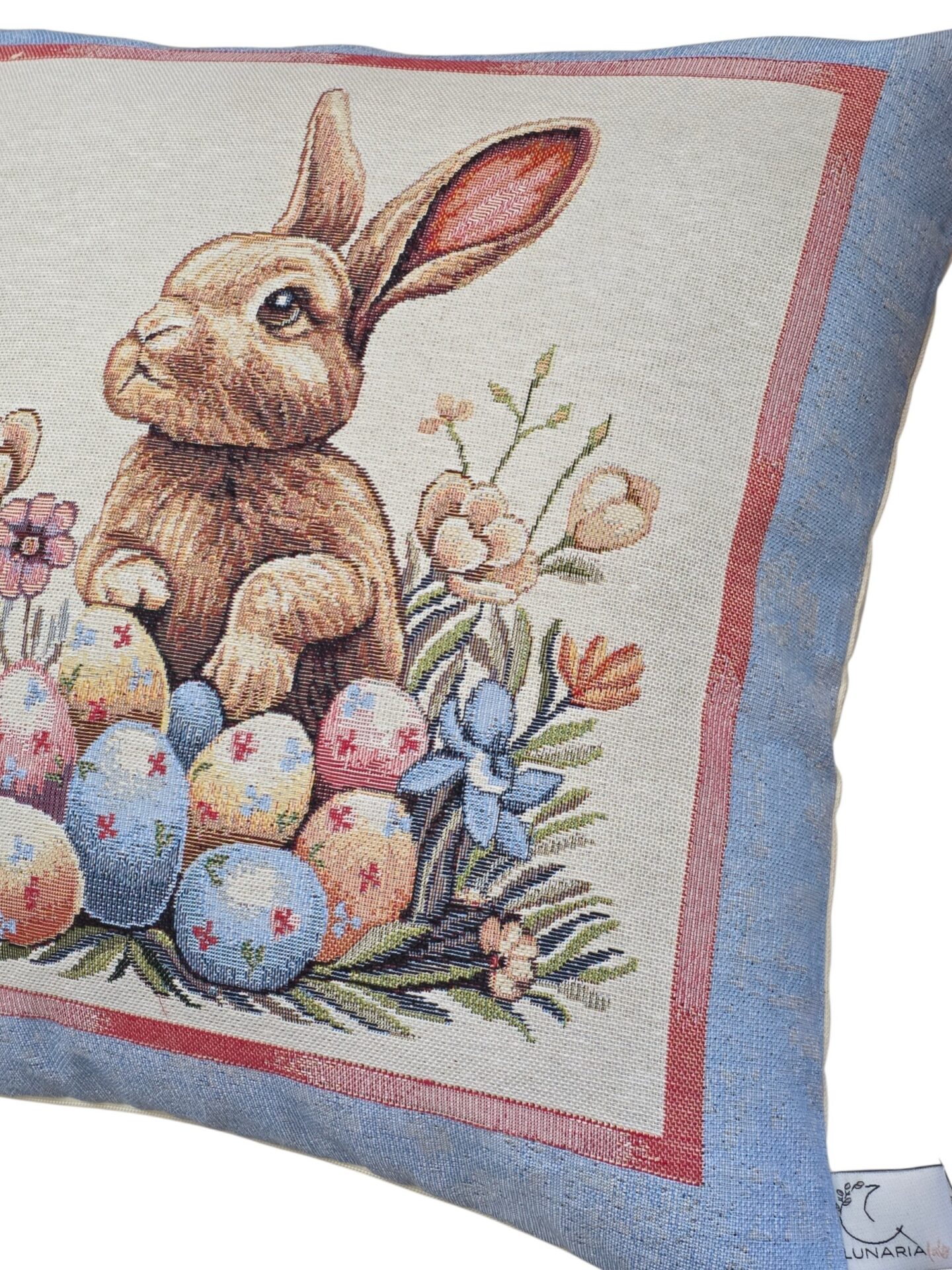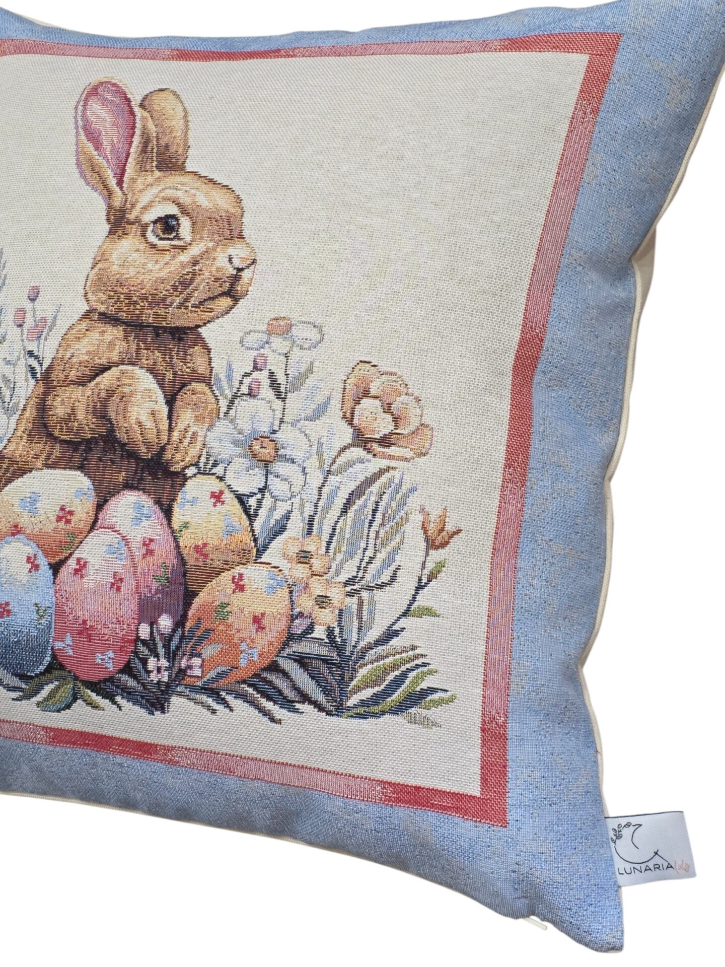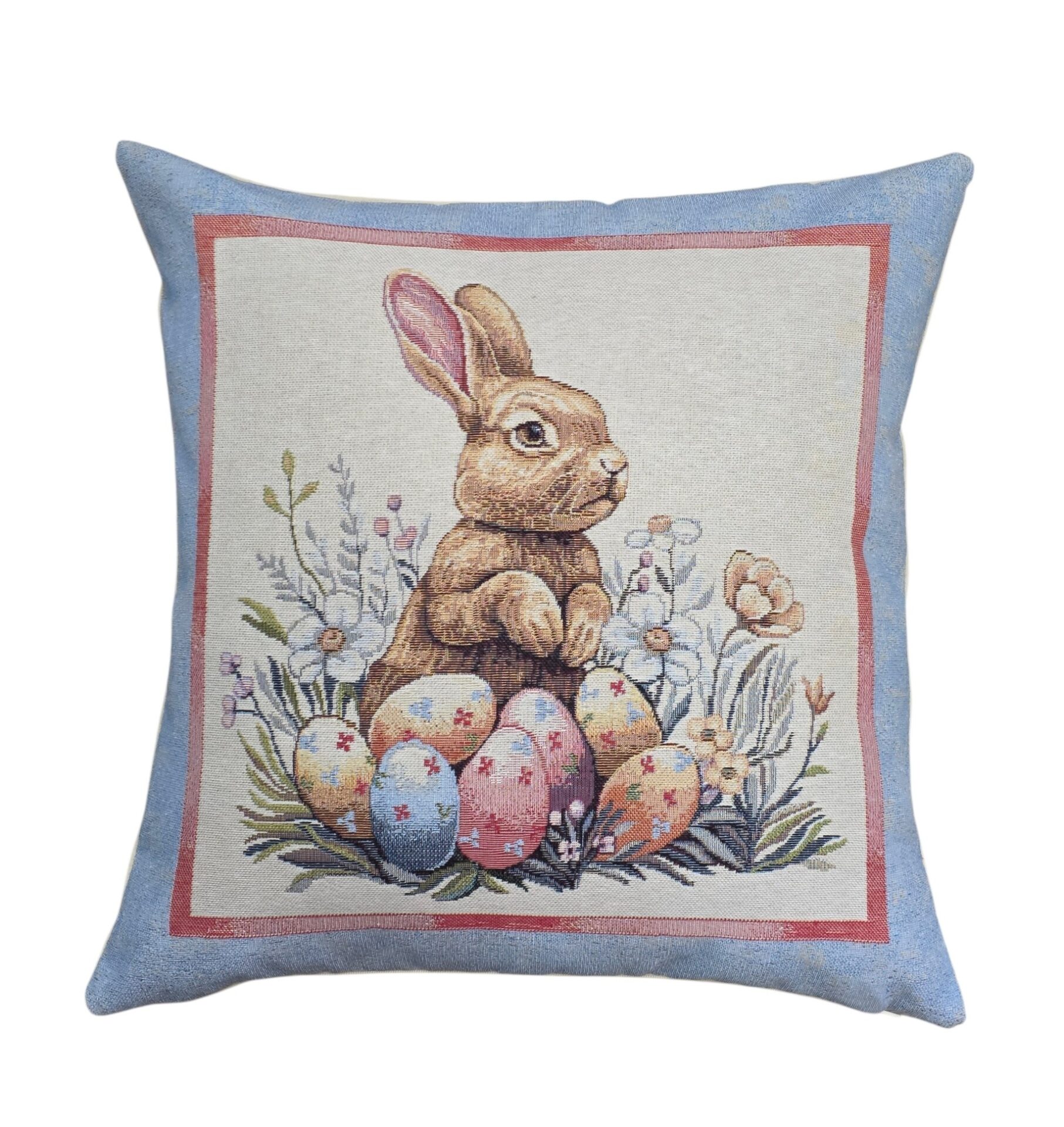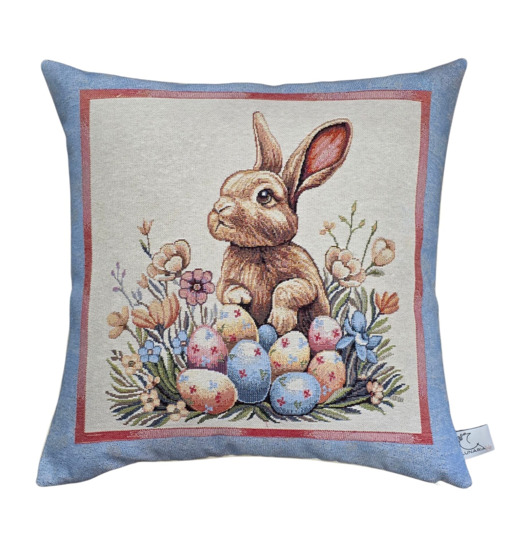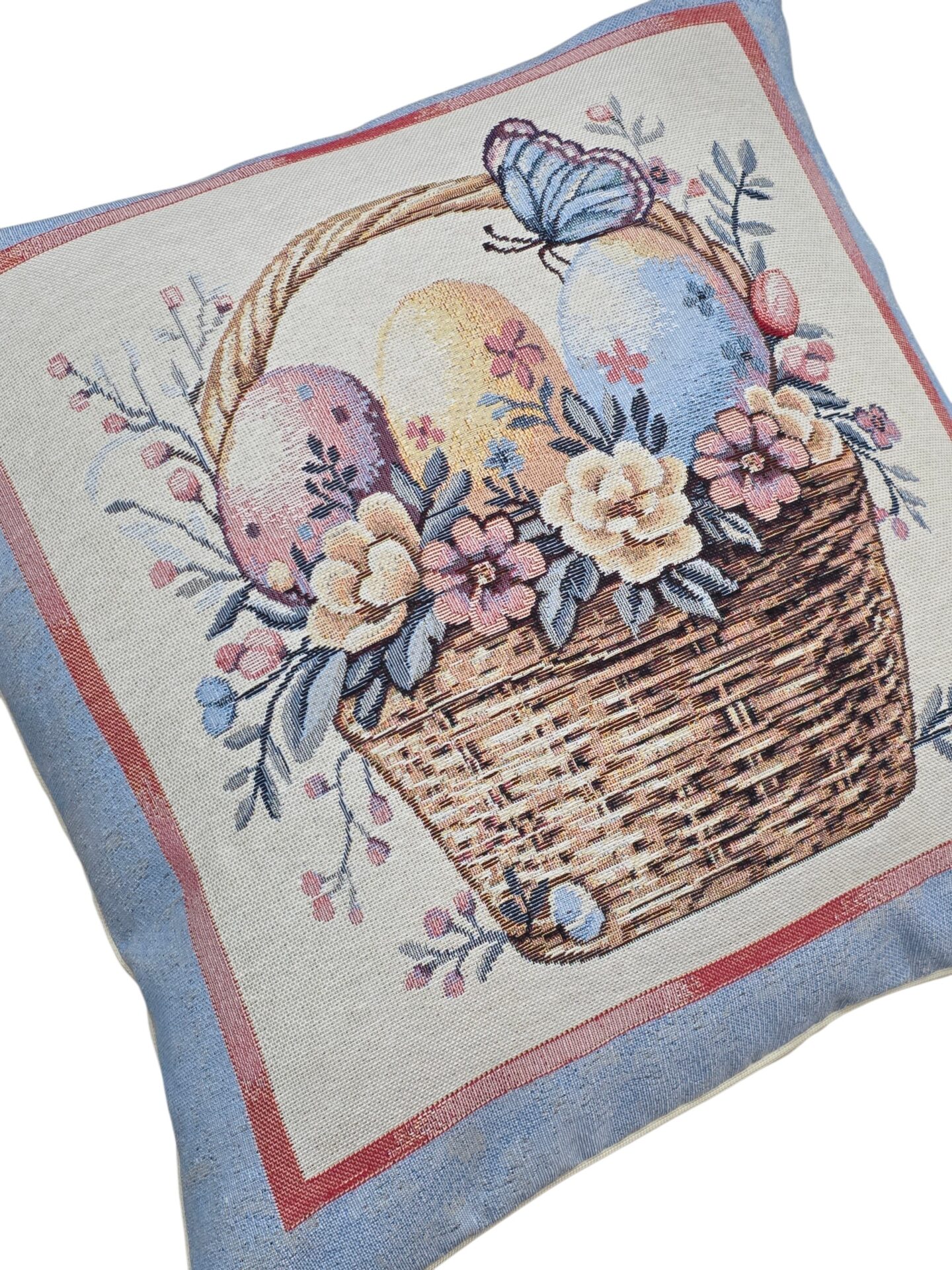 Queste eleganti federe per cuscini a tema pasquale portano un tocco di primavera e festività nella vostra casa. Realizzate in pregiato tessuto gobelin, presentano tre deliziosi motivi: un adorabile coniglietto circondato da uova colorate e fiori primaverili, un cestino intrecciato ricolmo di uova decorate con una graziosa farfalla blu, e un tenero coniglietto seduto tra uova pasquali e delicate fioriture. Ogni federa è incorniciata da un elegante bordo azzurro polvere con dettagli rosa che esalta i colori pastello delle illustrazioni. Le dimensioni di 45×45 cm le rendono perfette per la maggior parte dei cuscini standard. Queste federe sono ideali per decorare divani, poltrone o letti durante la stagione pasquale, creando un’atmosfera accogliente e festosa. Il tessuto gobelin garantisce durata e una texture ricca che aggiunge profondità visiva a qualsiasi ambiente. Perfette come decorazione per la tavola pasquale o come regalo per chi ama rinnovare la propria casa seguendo le stagioni.