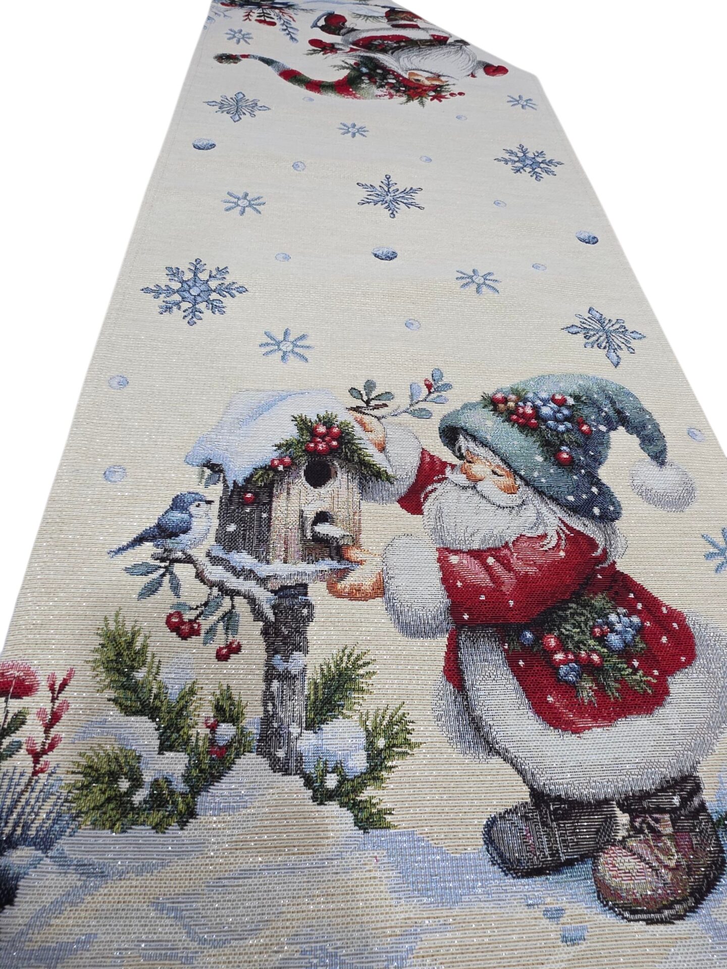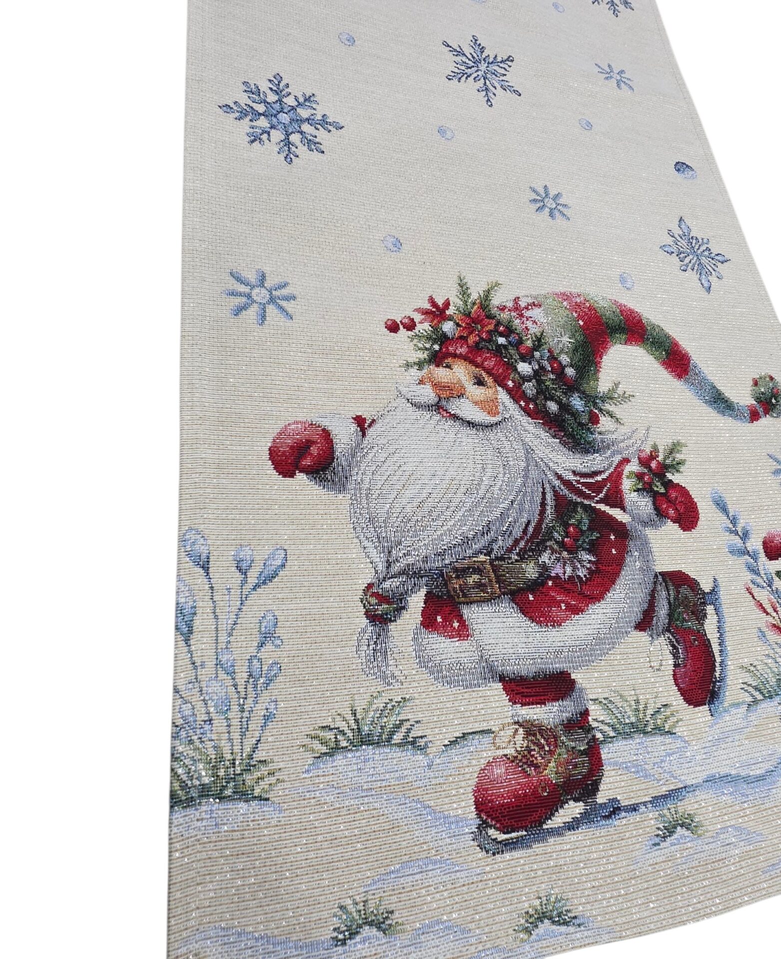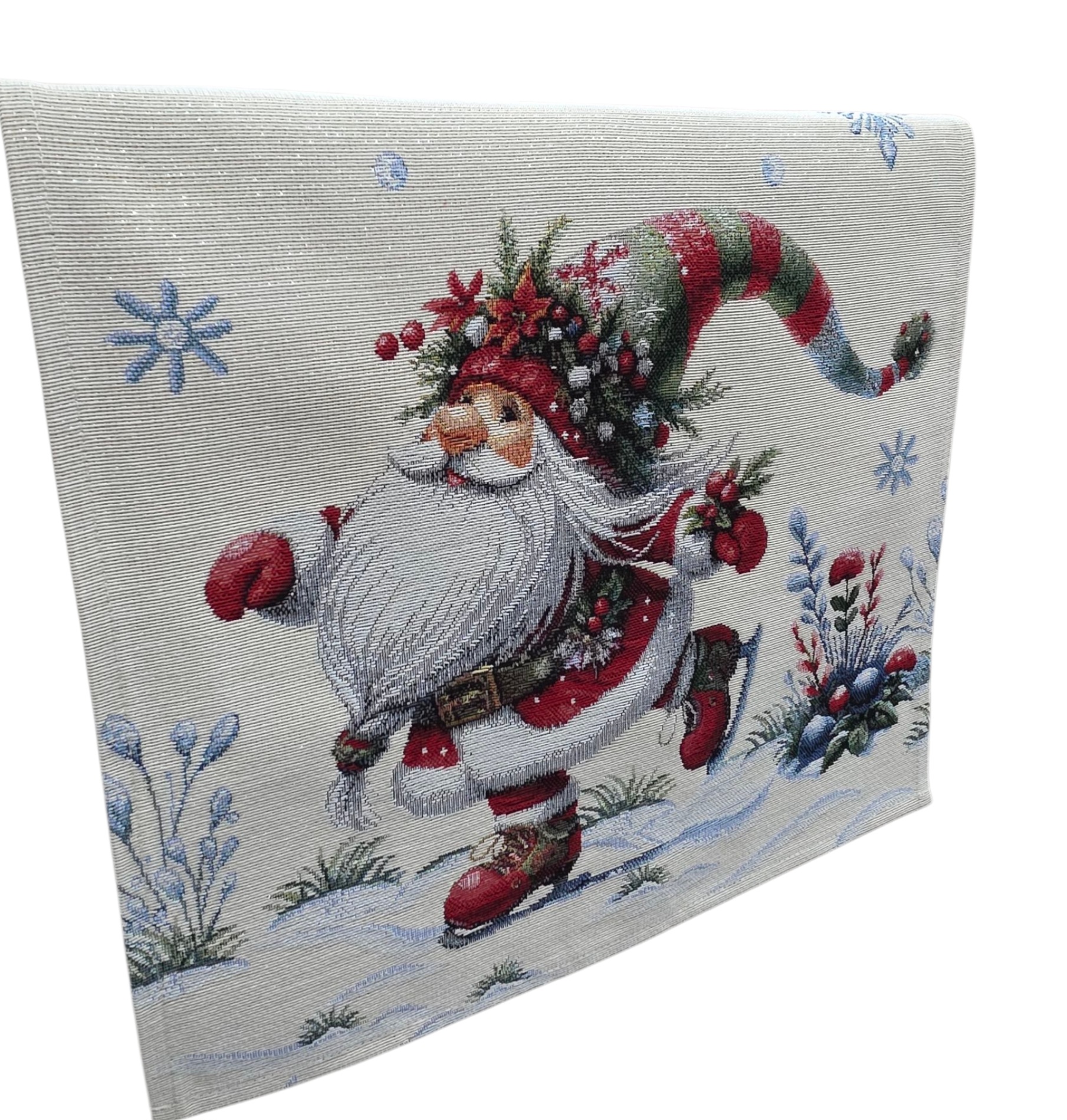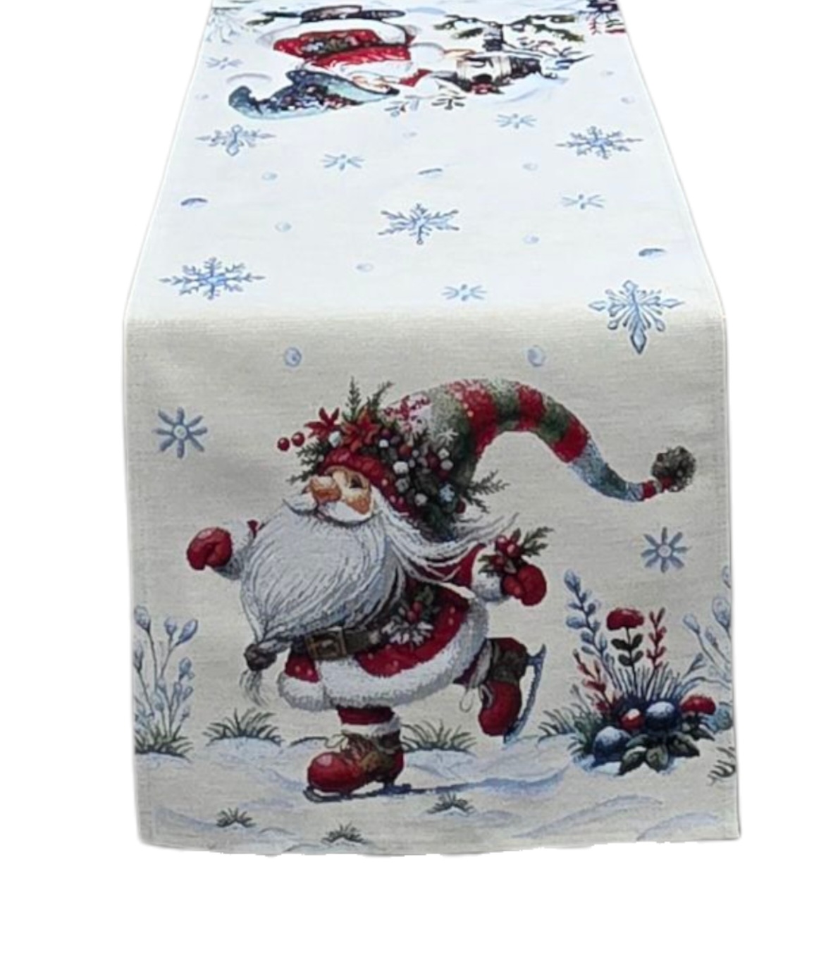 Aggiungi un tocco magico alle tue decorazioni natalizie con questo incantevole runner da tavola. Realizzato in pregiato tessuto Gobellin con dettagli in lurex, presenta un adorabile design invernale con un gioioso gnomo pattinatore che danza in un paesaggio innevato. Il motivo è arricchito da fiocchi di neve scintillanti, bacche rosse e una deliziosa casetta per uccelli, creando un’atmosfera festiva perfetta. Disponibile in due dimensioni pratiche: 40×100 cm o 45×140 cm, questo runner si adatta perfettamente a diverse misure di tavolo. I colori tradizionali del Natale – rosso, bianco e verde – si fondono armoniosamente creando una scenografia invernale che cattura lo spirito delle feste. Il tessuto Gobelin garantisce durevolezza e una finitura di alta qualità, rendendo questo runner un elemento decorativo che potrai utilizzare durante tutte le festività natalizie. Un accessorio perfetto per creare un’atmosfera accogliente e festosa sulla tua tavola.