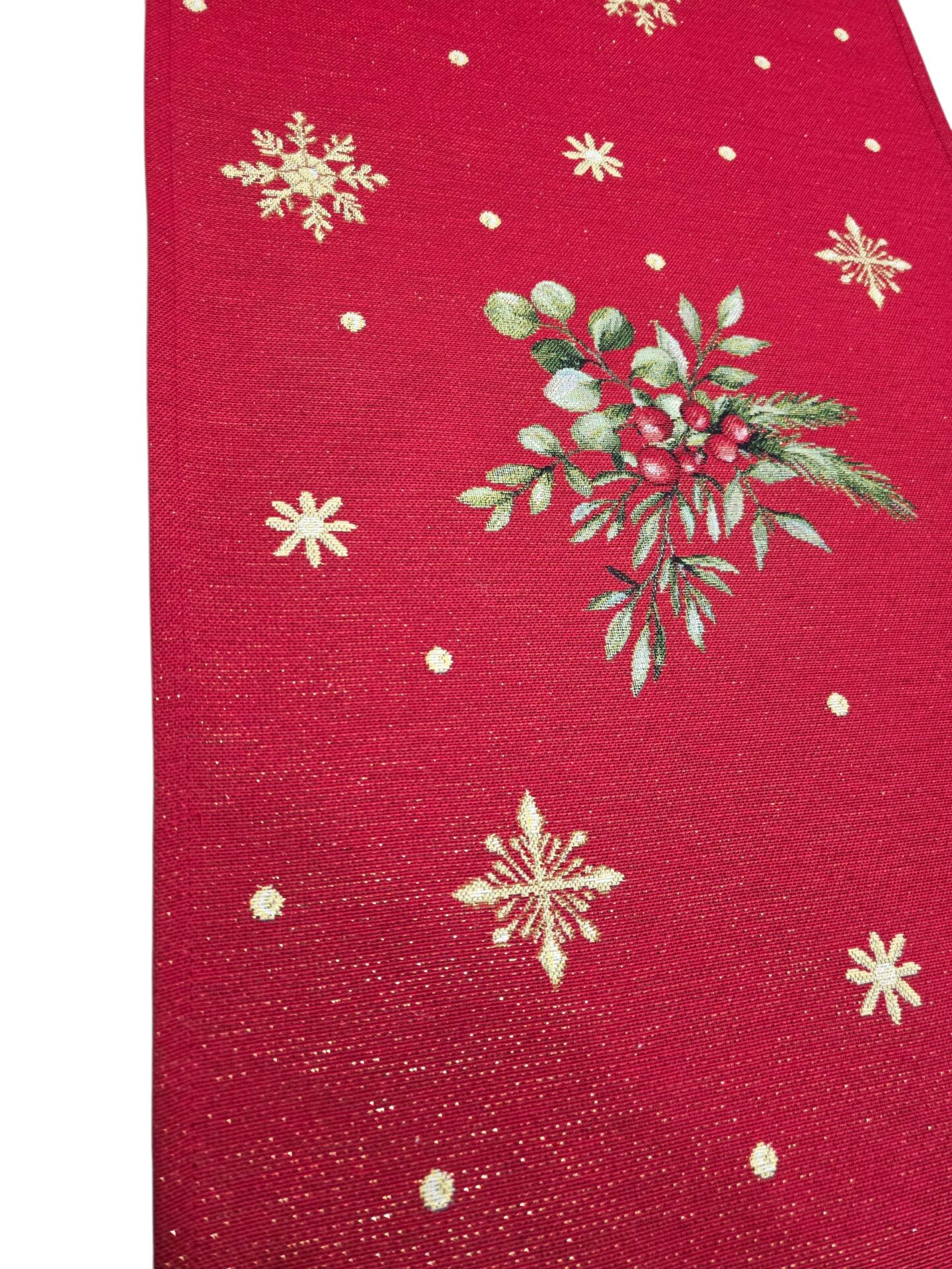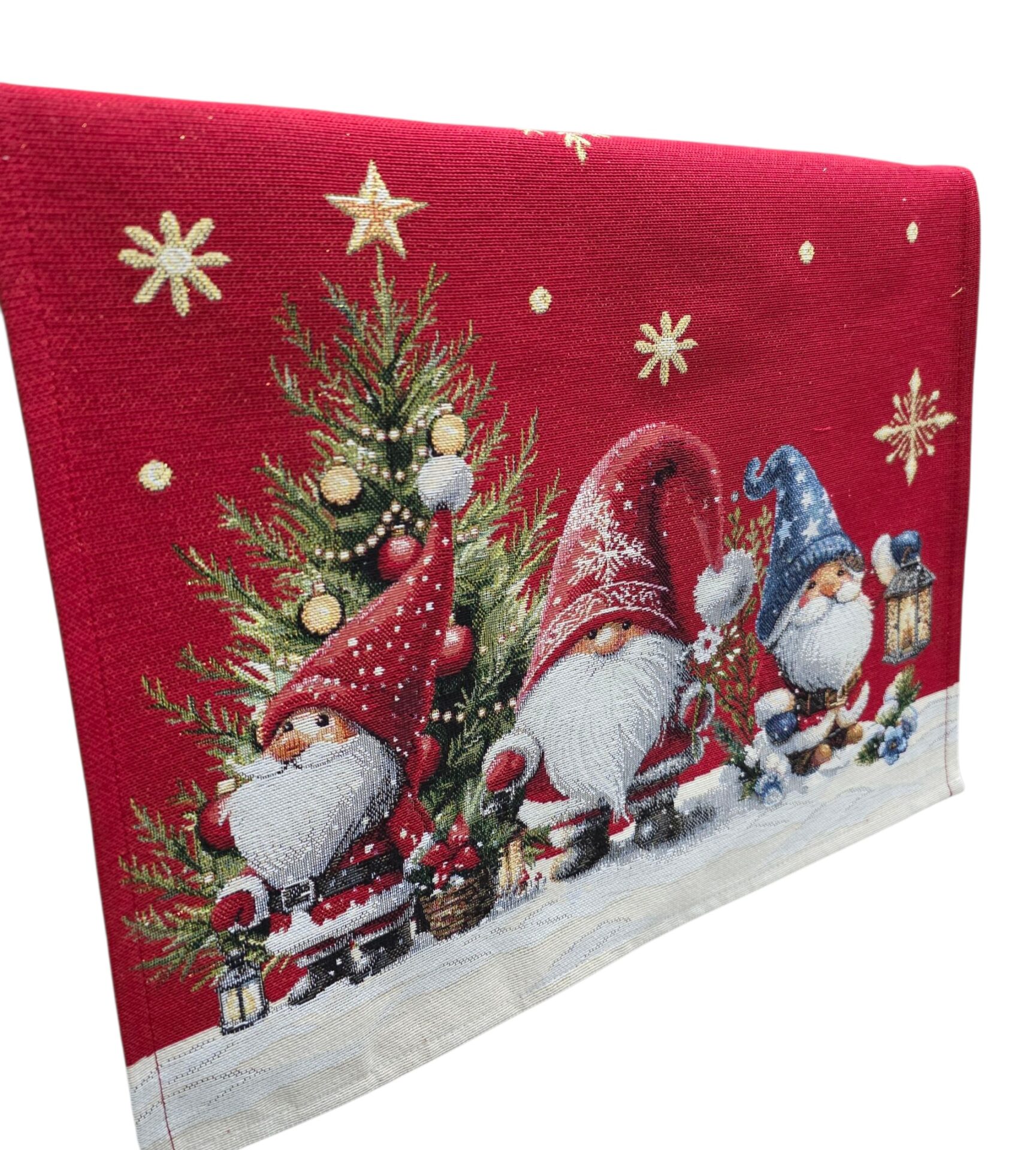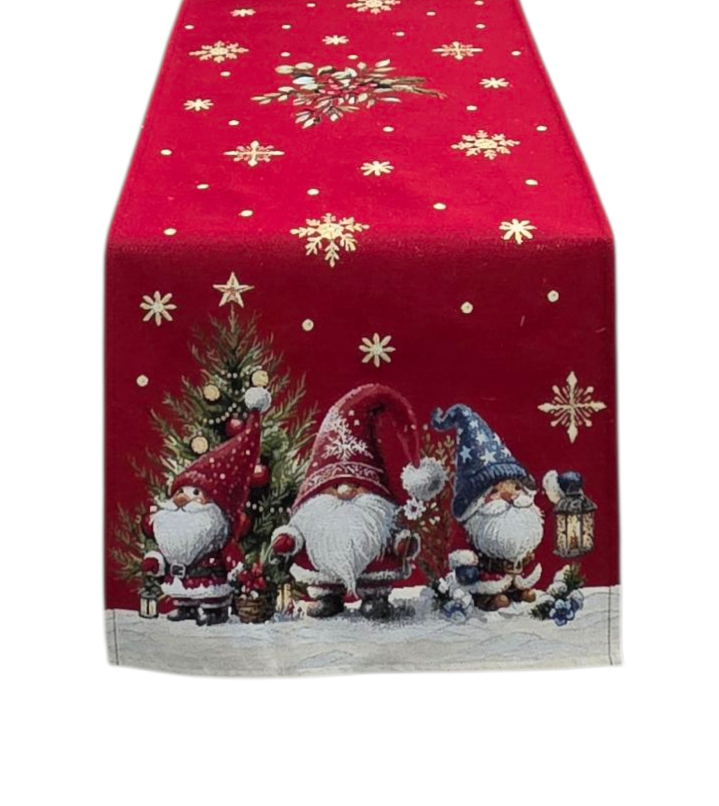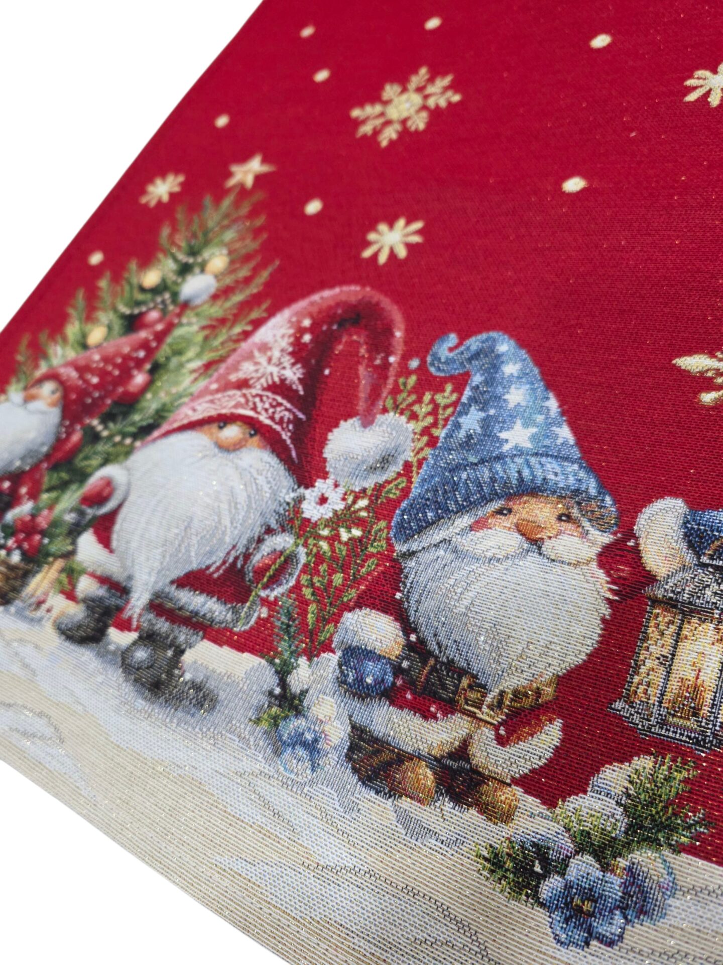 Porta un tocco di magia natalizia alla tua tavola con questo incantevole runner natalizio. Realizzato in pregiato tessuto Gobellin, questo elegante centrotavola presenta un affascinante trio di gnomi con barbe bianche e cappelli colorati su uno sfondo rosso brillante. Il design raffigura un paesaggio innevato con gnomi festivi che portano lanterne e decorazioni natalizie, circondati da fiocchi di neve luccicanti in Lurex che aggiungono un tocco di splendore. Disponibile in due dimensioni pratiche (40x100cm o 45x140cm), questo runner è perfetto per decorare la tua tavola durante le festività o come elemento decorativo su credenze e mobili. I dettagli finemente ricamati e i colori vivaci rendono questo accessorio un elemento imprescindibile per creare un’atmosfera calda e accogliente durante il periodo natalizio. Un regalo ideale per chi ama arricchire la propria casa con decorazioni festive di qualità.