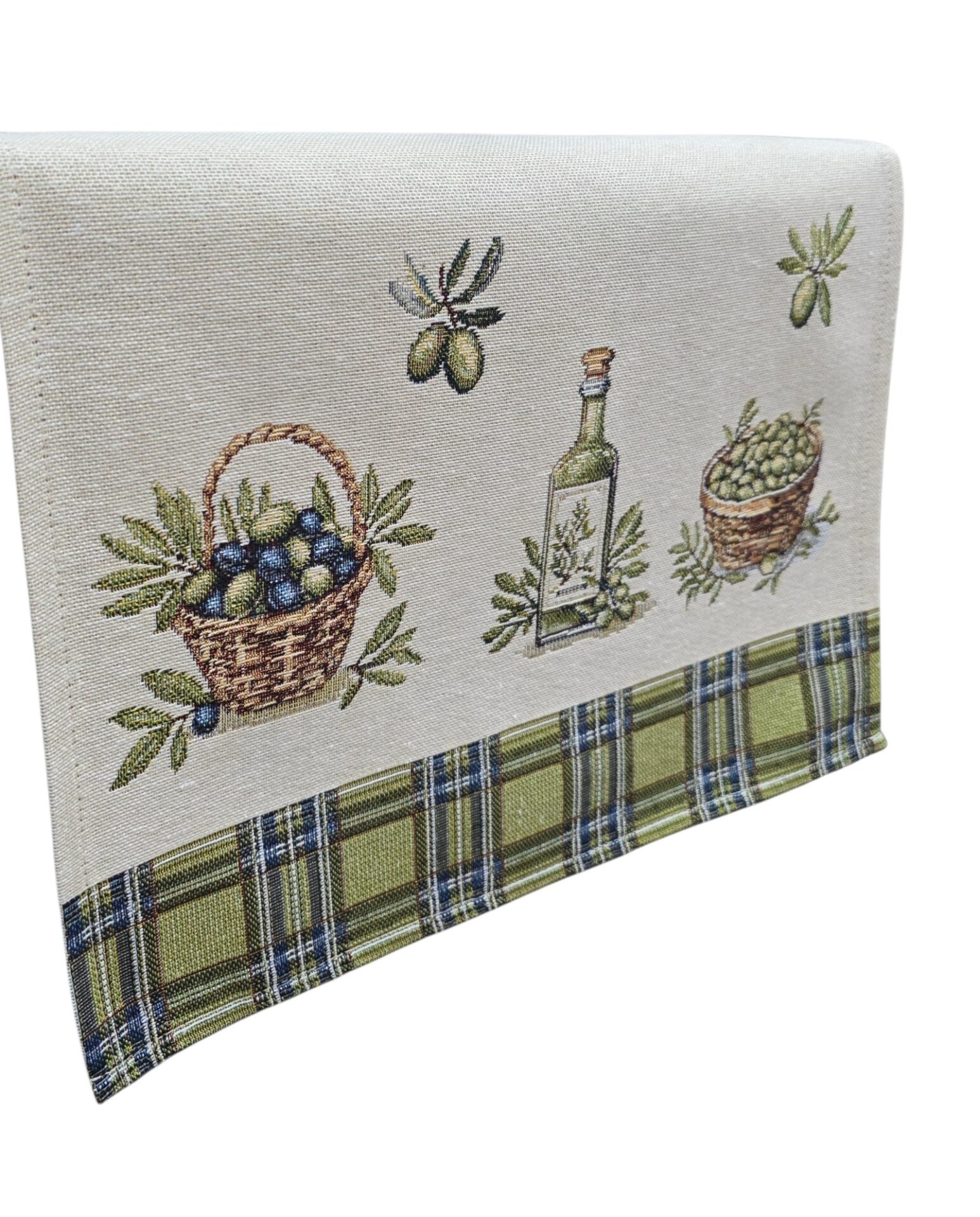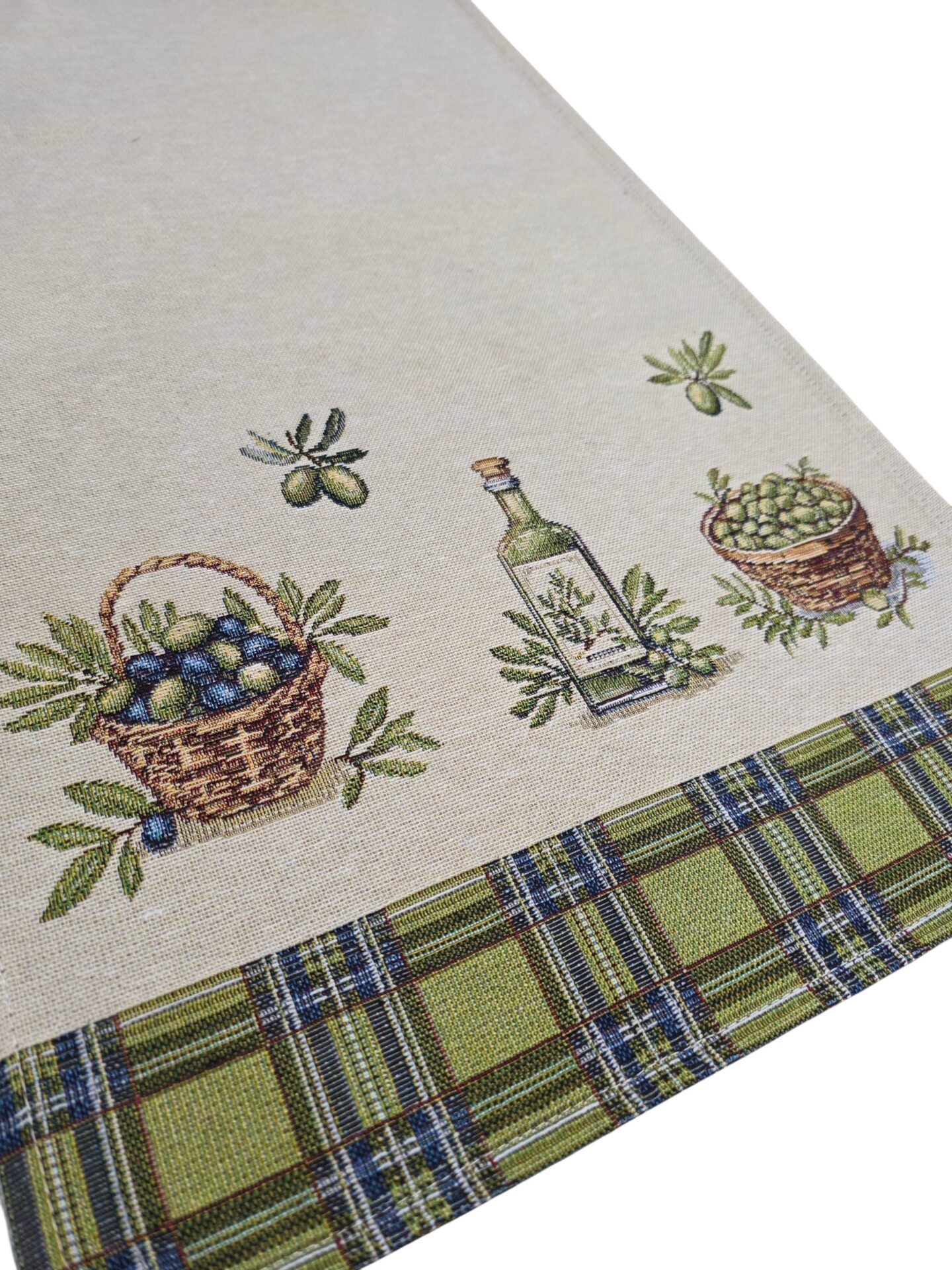 Questo elegante runner da tavola in Gobelin porta un tocco di charme mediterraneo nella vostra casa. Caratterizzato da un raffinato motivo che celebra la tradizione olivicola, il tessuto presenta delicate illustrazioni di olive verdi e nere, cesti intrecciati colmi di frutti, e bottiglie d’olio d’oliva che evocano l’atmosfera delle campagne del Sud. Il design è impreziosito da un bordo scozzese nei toni del verde e blu che aggiunge un contrasto elegante e sofisticato. Realizzato in tessuto Gobelin di qualità, questo runner garantisce durata e resistenza nel tempo, mantenendo i colori vividi anche dopo numerosi utilizzi. Disponibile in due dimensioni versatili – 40x100cm e 45x140cm – si adatta perfettamente a tavoli di diverse lunghezze, sia per l’uso quotidiano che per occasioni speciali. Ideale per creare un’atmosfera accogliente durante pranzi e cene, questo runner trasforma la vostra tavola in un angolo di stile rustico-chic. Perfetto per chi ama lo stile country o mediterraneo e desidera portare un tocco di natura e tradizione nella propria sala da pranzo.