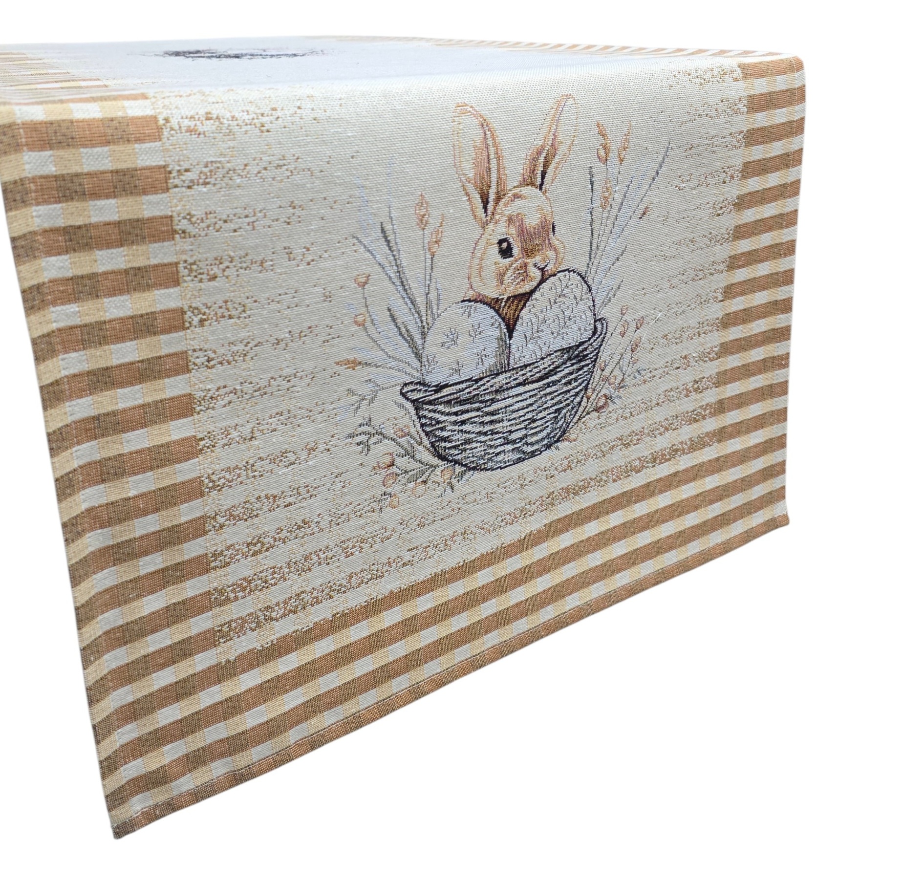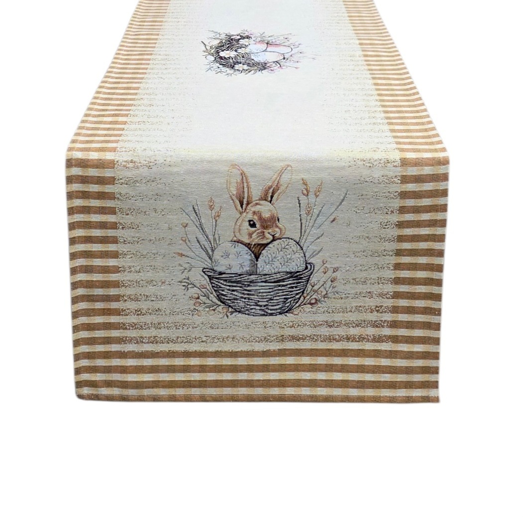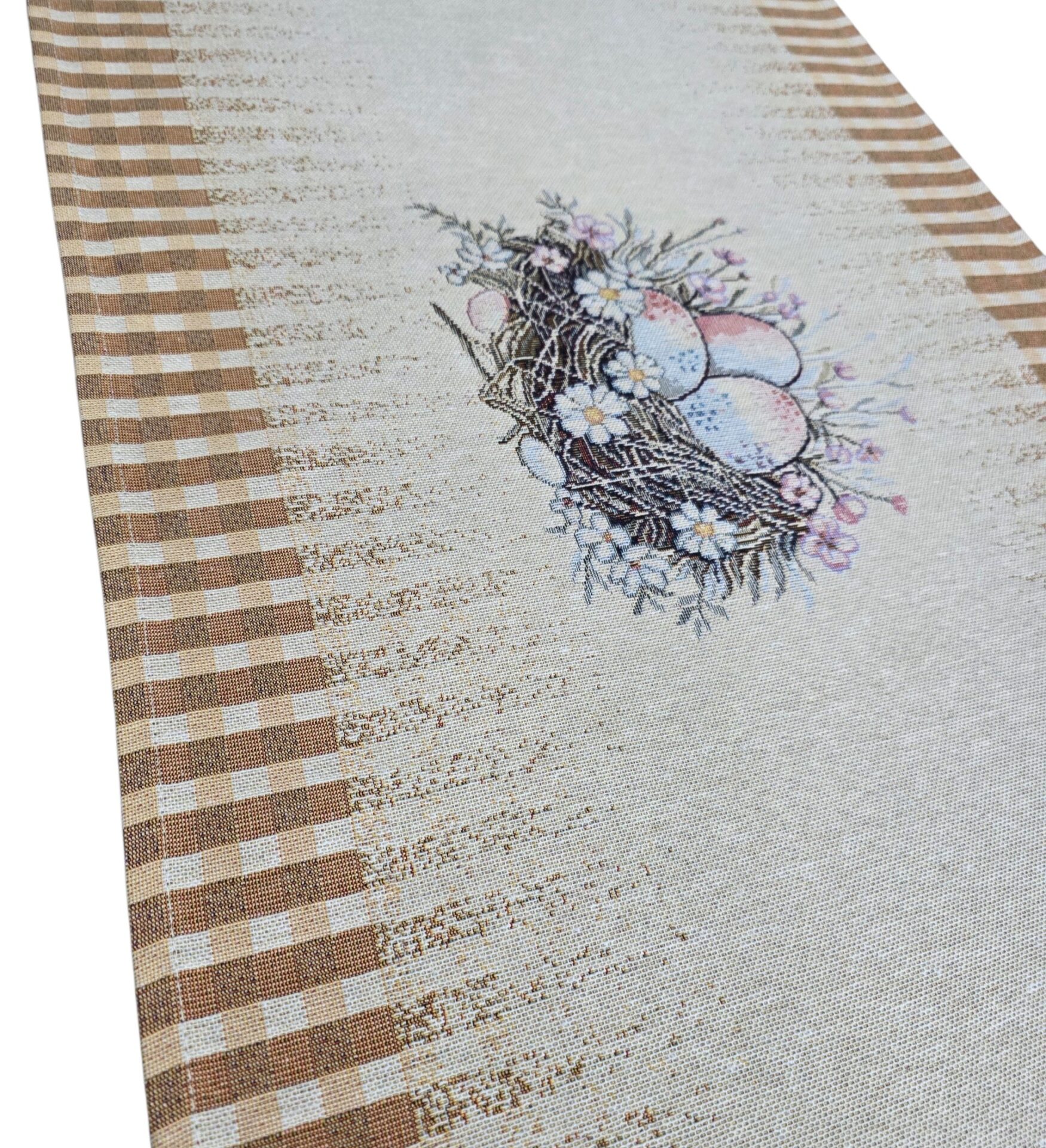Questo elegante runner pasquale in gobelin porta un tocco di primavera e festività alla vostra tavola. Il design incantevole presenta adorabili conigli in un nido di uova, circondati da delicati fiori e paesaggi primaverili che catturano perfettamente lo spirito della Pasqua. Il motivo centrale raffigura una famiglia di conigli con uova in un cesto intrecciato, creando una scena tenera e accogliente. Il bordo a quadri beige aggiunge un elemento classico e raffinato che si abbina facilmente a diverse decorazioni da tavola. Realizzato in tessuto gobelin di qualità, questo runner offre una texture ricca e dettagli nitidi che valorizzano ogni elemento decorativo. Disponibile in due dimensioni pratiche – 40x100cm e 45x140cm – si adatta perfettamente a tavoli di diverse dimensioni, dal tavolino da caffè alla tavola da pranzo. Ideale per celebrare la Pasqua con stile, questo runner trasforma la vostra tavola in un’accogliente scena primaverile che delizierà famiglia e ospiti durante le festività pasquali.