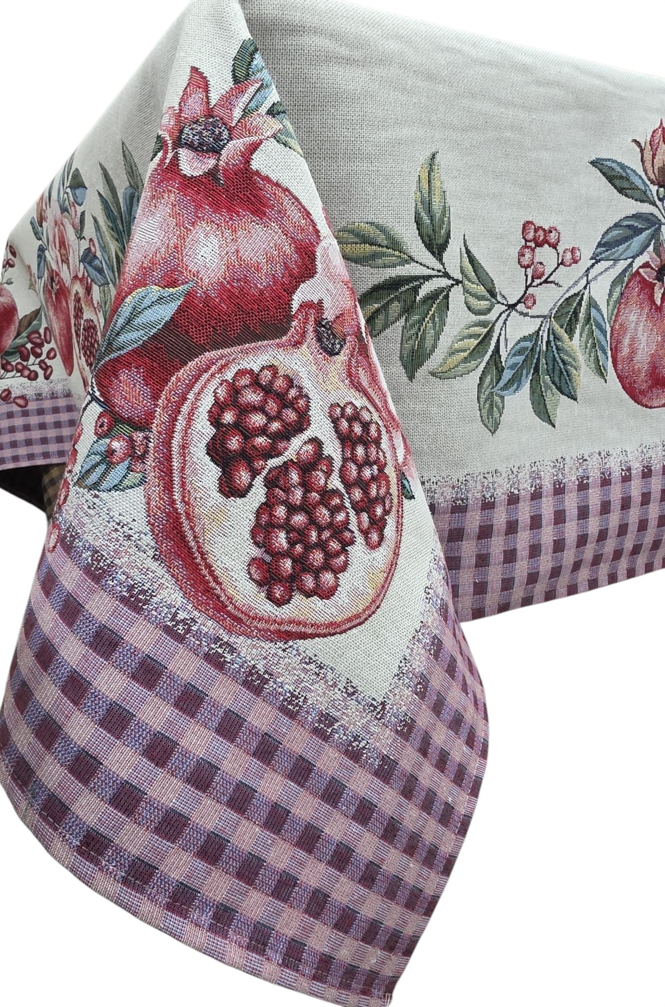 Questa elegante tovaglia in gobelin trasformerà la vostra tavola in un’opera d’arte. Il design raffinato presenta melograni rossi intensi accompagnati da delicati fiori rosa e foglie verdi su uno sfondo chiaro, creando un’atmosfera sofisticata e accogliente. Il bordo decorativo a quadri viola e rosa aggiunge un tocco di charme rustico che completa perfettamente il motivo floreale centrale. Realizzata in tessuto gobelin di qualità, questa tovaglia unisce durabilità ed estetica, rendendola ideale sia per l’uso quotidiano che per le occasioni speciali. Il copritavolo è disponibile in due dimensioni versatili: 140x180cm e 140x240cm, perfette per adattarsi a diverse configurazioni di tavoli. Il tessuto gobelin è apprezzato per la sua resistenza e la capacità di mantenere i colori vividi nel tempo. Questa tovaglia con motivo a melograno porterà un tocco di eleganza mediterranea alla vostra sala da pranzo, creando l’atmosfera perfetta per pranzi in famiglia o cene con gli ospiti.
