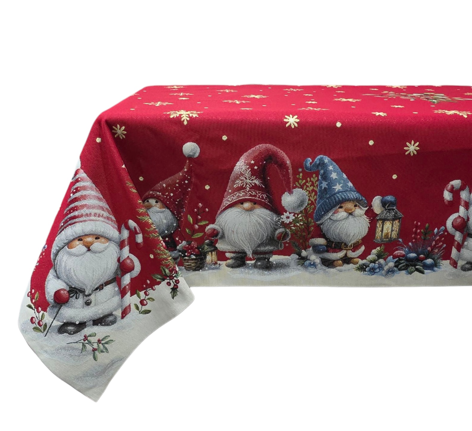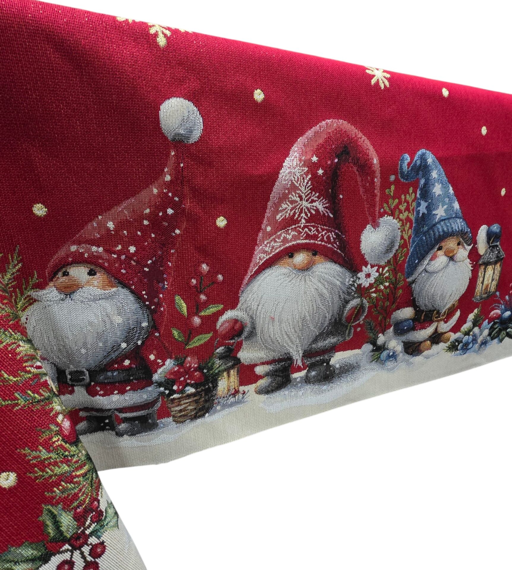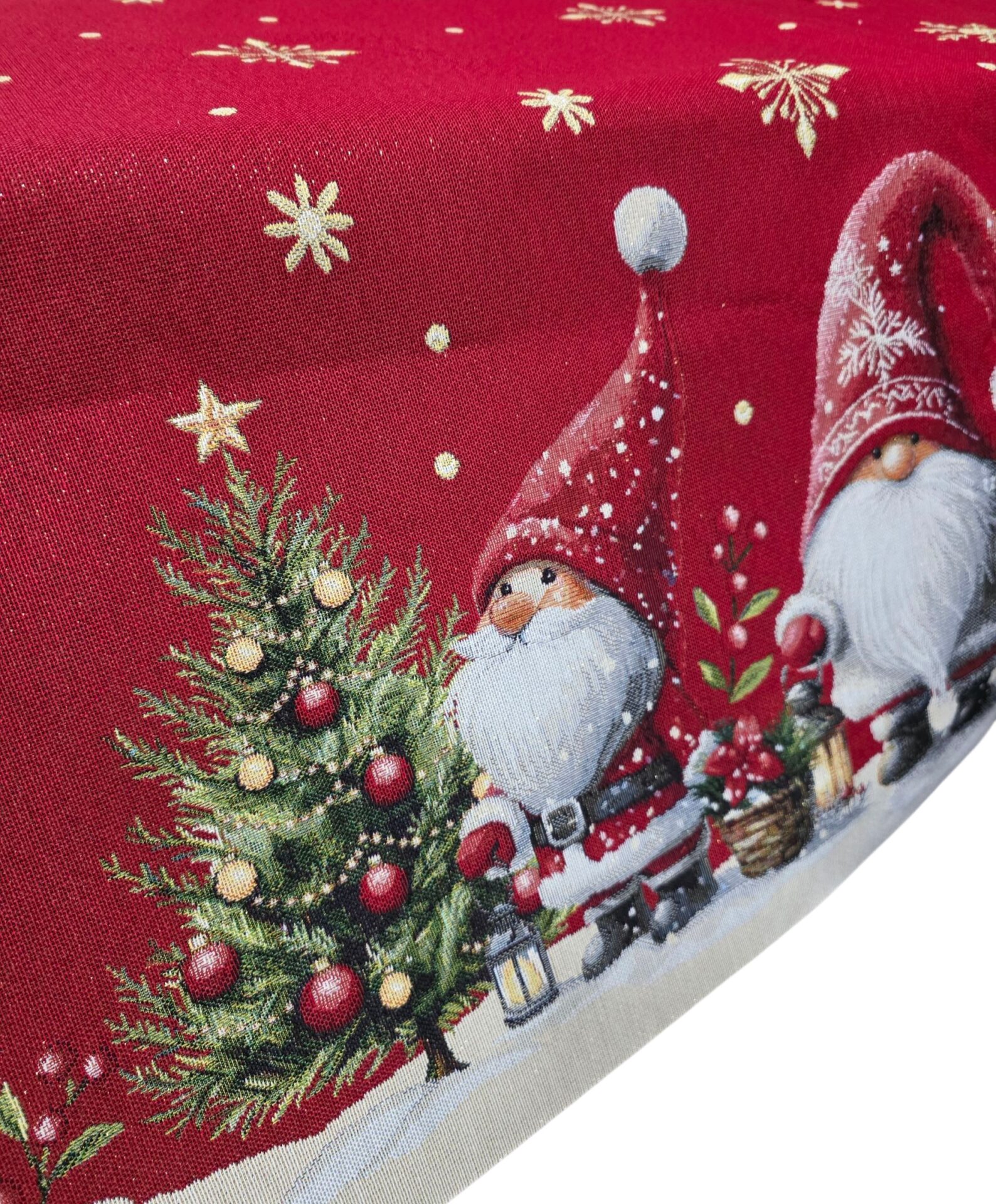 Porta l’incanto natalizio sulla tua tavola con questa splendida tovaglia decorativa da 140x240cm. Realizzata in pregiato tessuto Gobelin, presenta un affascinante motivo festivo su sfondo rosso con deliziosi gnomi e elfi in un paesaggio innevato. Il design include un incantevole tris di gnomi natalizi dalle lunghe barbe bianche, circondati da ghirlande festive e scintillanti fiocchi di neve in lurex che aggiungono un tocco di magia. I dettagli accurati del ricamo catturano perfettamente l’atmosfera natalizia, con piccole stelle dorate sparse sul fondo rosso intenso che creano un effetto celestiale. Questa tovaglia è l’accessorio perfetto per decorare la tua tavola durante le festività , combinando eleganza e spirito natalizio in un unico pezzo d’arredo. Il tessuto Gobelin garantisce resistenza e una resa estetica superiore, mantenendo la sua bellezza nel tempo. Ideale per creare un’atmosfera festiva e accogliente durante i pranzi e le cene natalizie in famiglia.