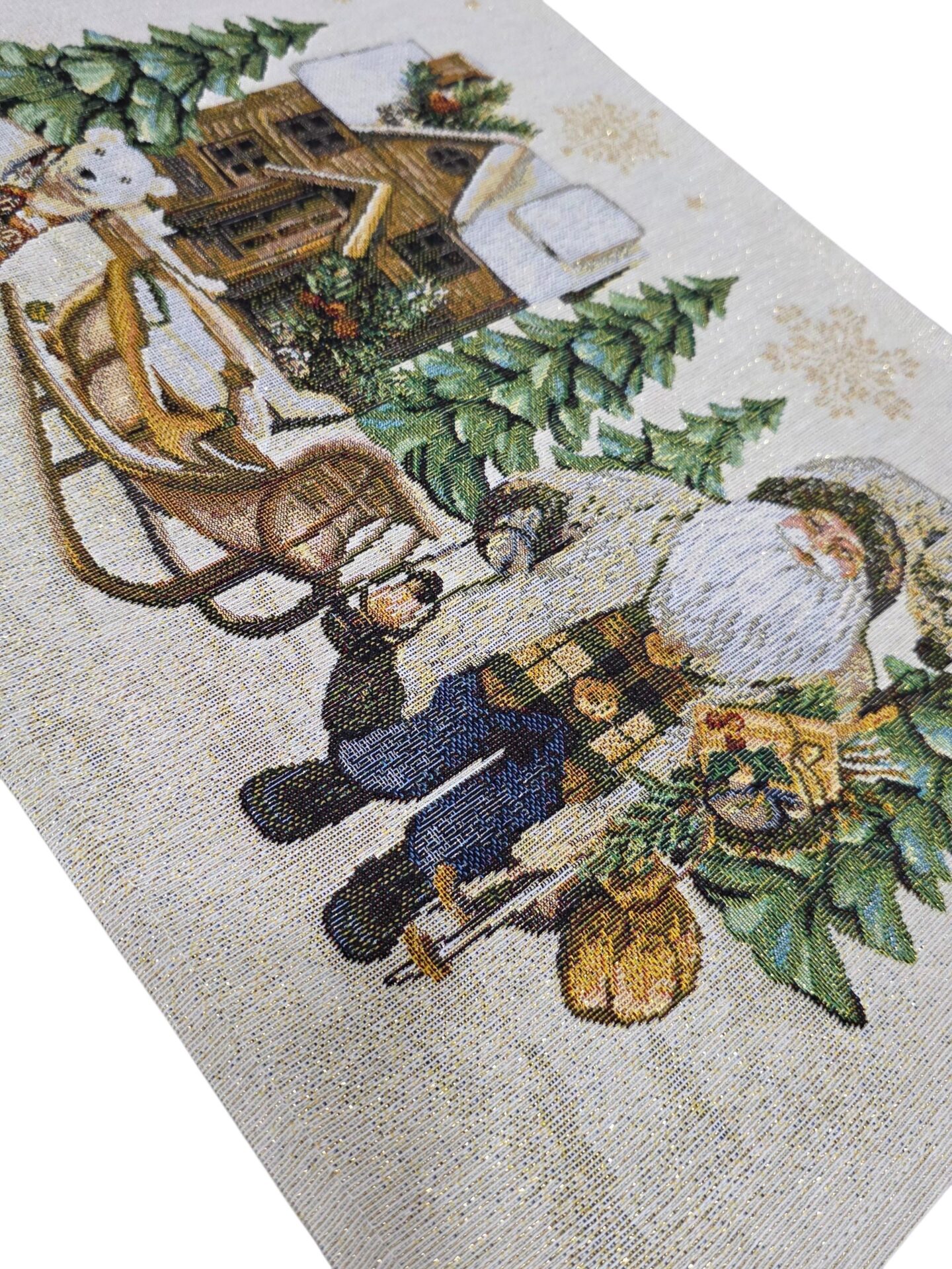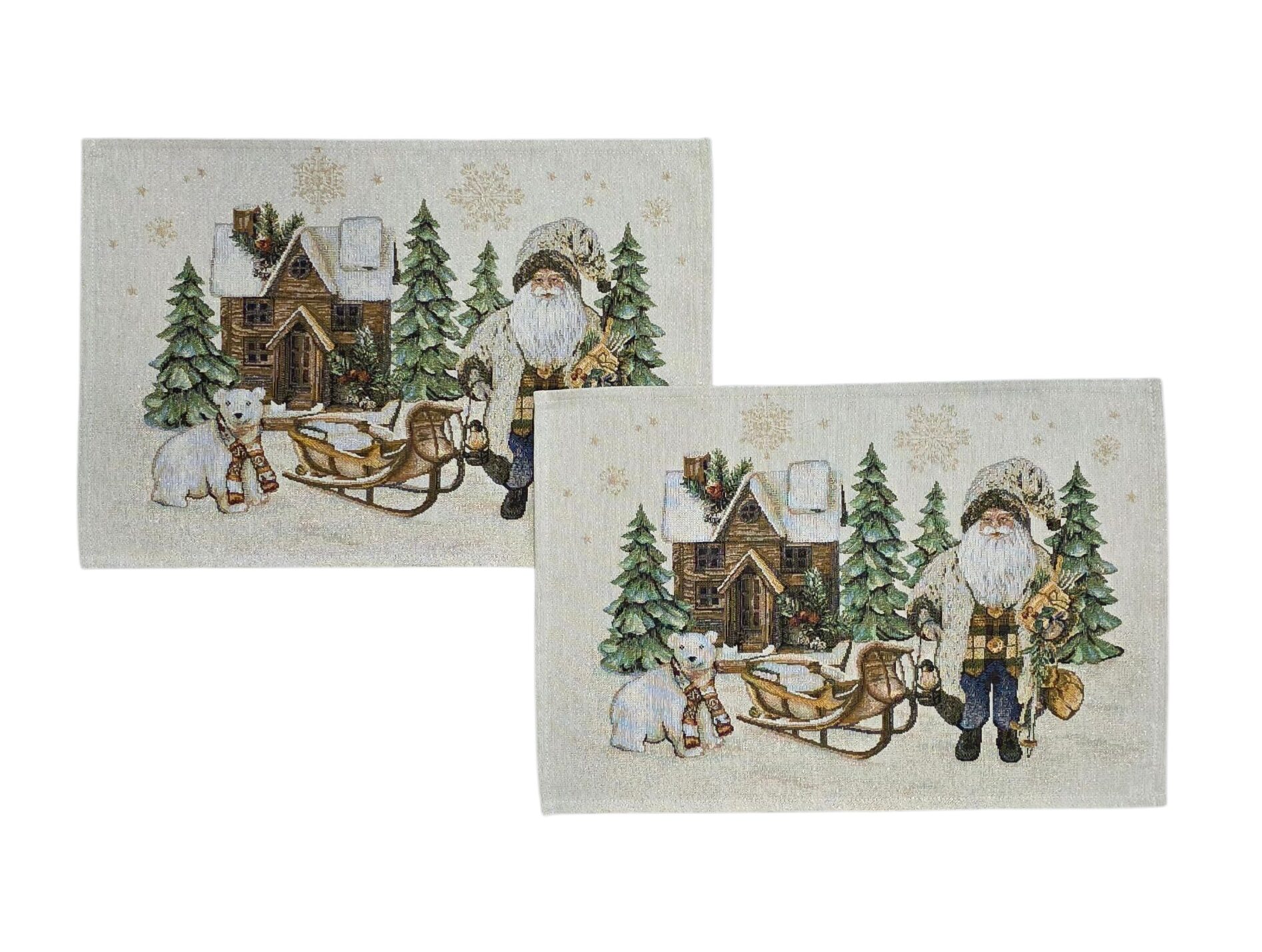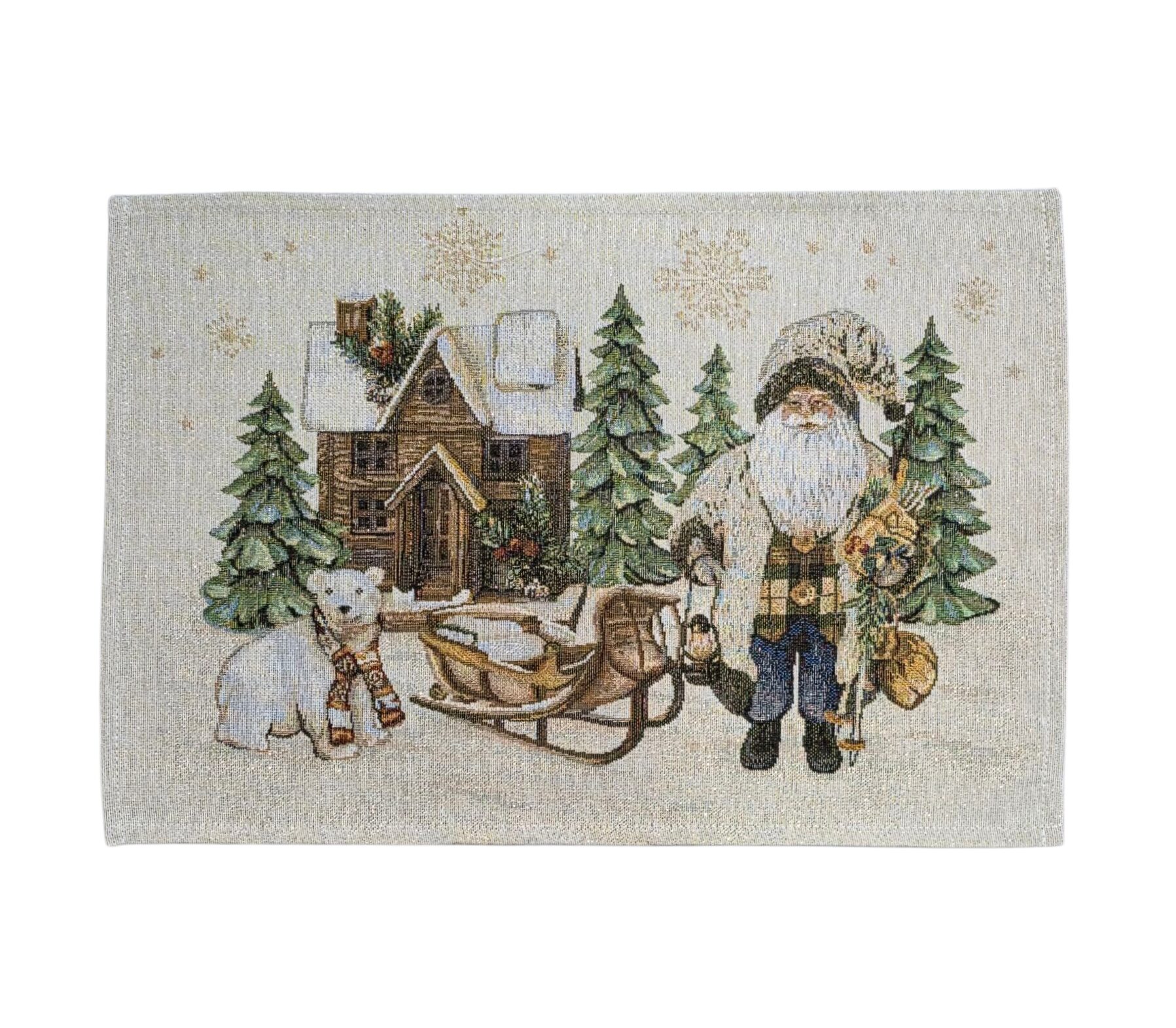 Trasforma la tua tavola natalizia con queste eleganti tovagliette in gobelin, che catturano perfettamente l’essenza magica del Natale. Ogni tovaglietta, misurando 33x49cm, presenta un’incantevole scena invernale con una baita di legno circondata da maestosi pini innevati. Il design include dettagli affascinanti come un orso polare con una sciarpa, una slitta tradizionale e un’atmosfera festiva arricchita da fiocchi di neve scintillanti realizzati in lurex. Queste tovagliette sono perfette per la colazione durante il periodo natalizio o per creare un’atmosfera festosa durante i pasti invernali. La combinazione di colori neutri e dettagli dorati in lurex si adatta perfettamente a qualsiasi decorazione natalizia. Queste tovagliette sono ideali per creare un’ambientazione accogliente e festosa sulla vostra tavola. Il materiale in gobelin garantisce praticità e resistenza, mantenendo allo stesso tempo un aspetto raffinato e festivo.