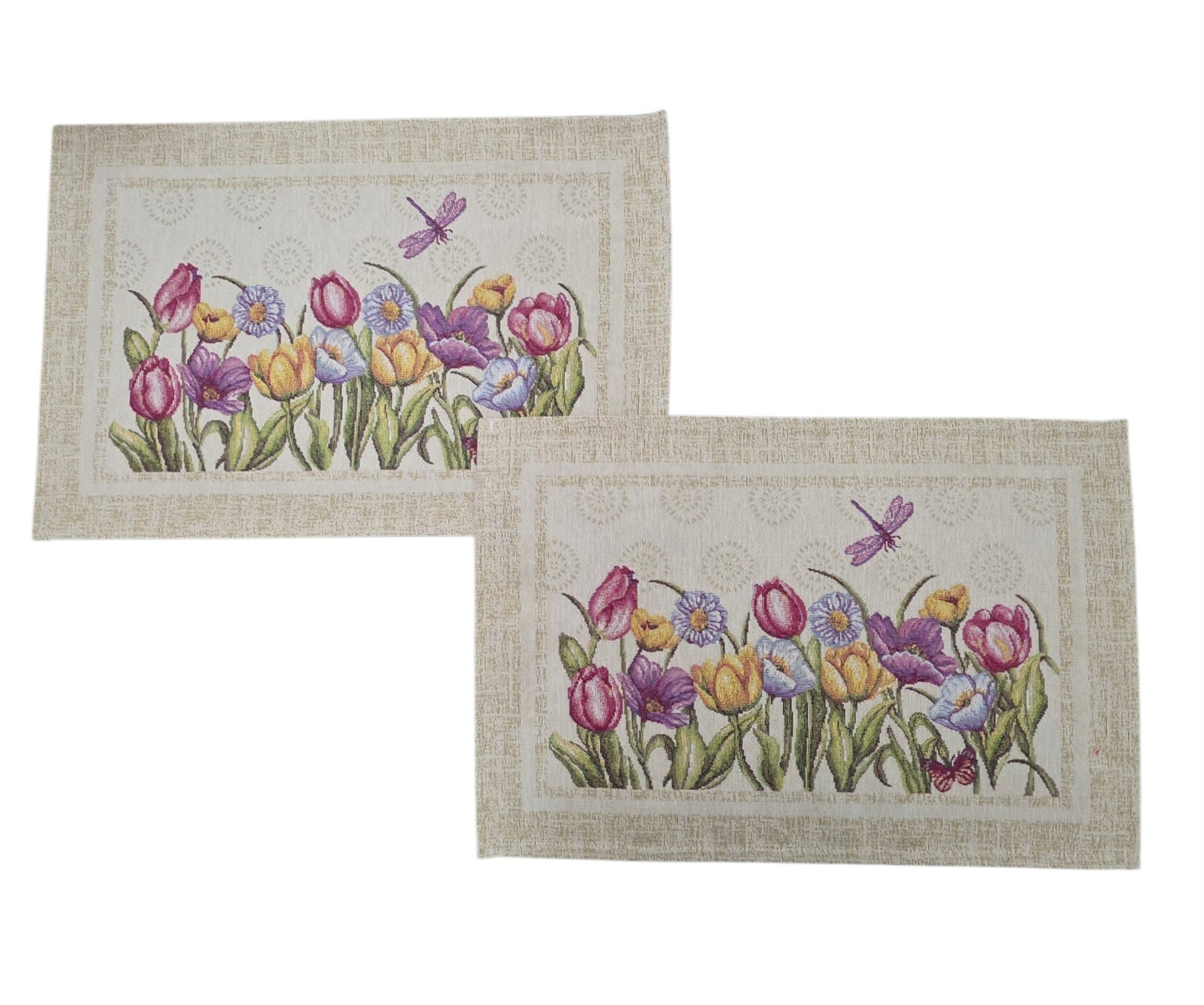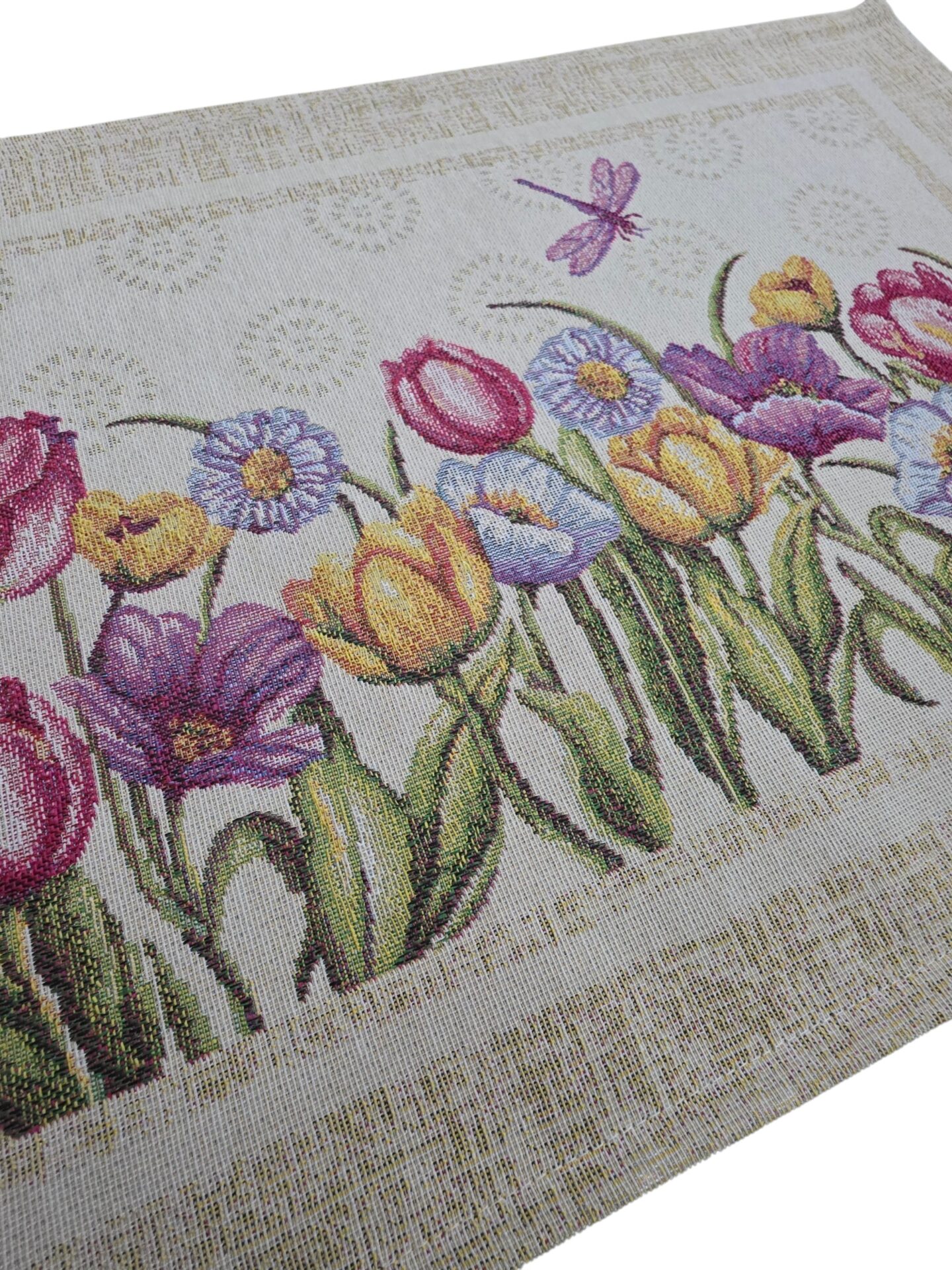 Queste eleganti tovagliette da colazione in gobelin sono il tocco perfetto per rendere la vostra tavola più vivace e accogliente. Realizzate con un tessuto pregiato, presentano un incantevole motivo floreale con tulipani colorati in rosa, giallo e viola, arricchito da delicate farfalle e libellule che donano un’atmosfera primaverile e allegra. Il bordo in tono beige-dorato incornicia perfettamente il disegno centrale, conferendo un aspetto raffinato ed elegante. Ogni tovaglietta misura 33×48 cm, una dimensione ideale per la colazione o per decorare la tavola in ogni occasione. Sono perfette per completare l’arredamento della vostra cucina o sala da pranzo. La lavorazione in gobelin garantisce colori vivaci e duraturi, rendendo queste tovagliette un accessorio pratico e decorativo allo stesso tempo. Ideali anche come regalo per gli amanti della natura e dei motivi floreali.