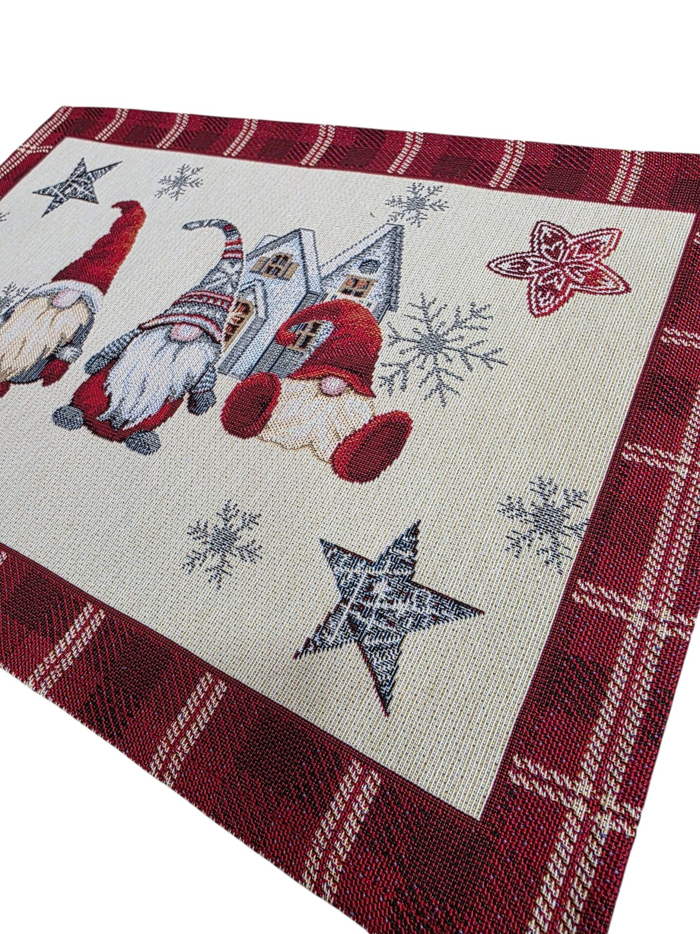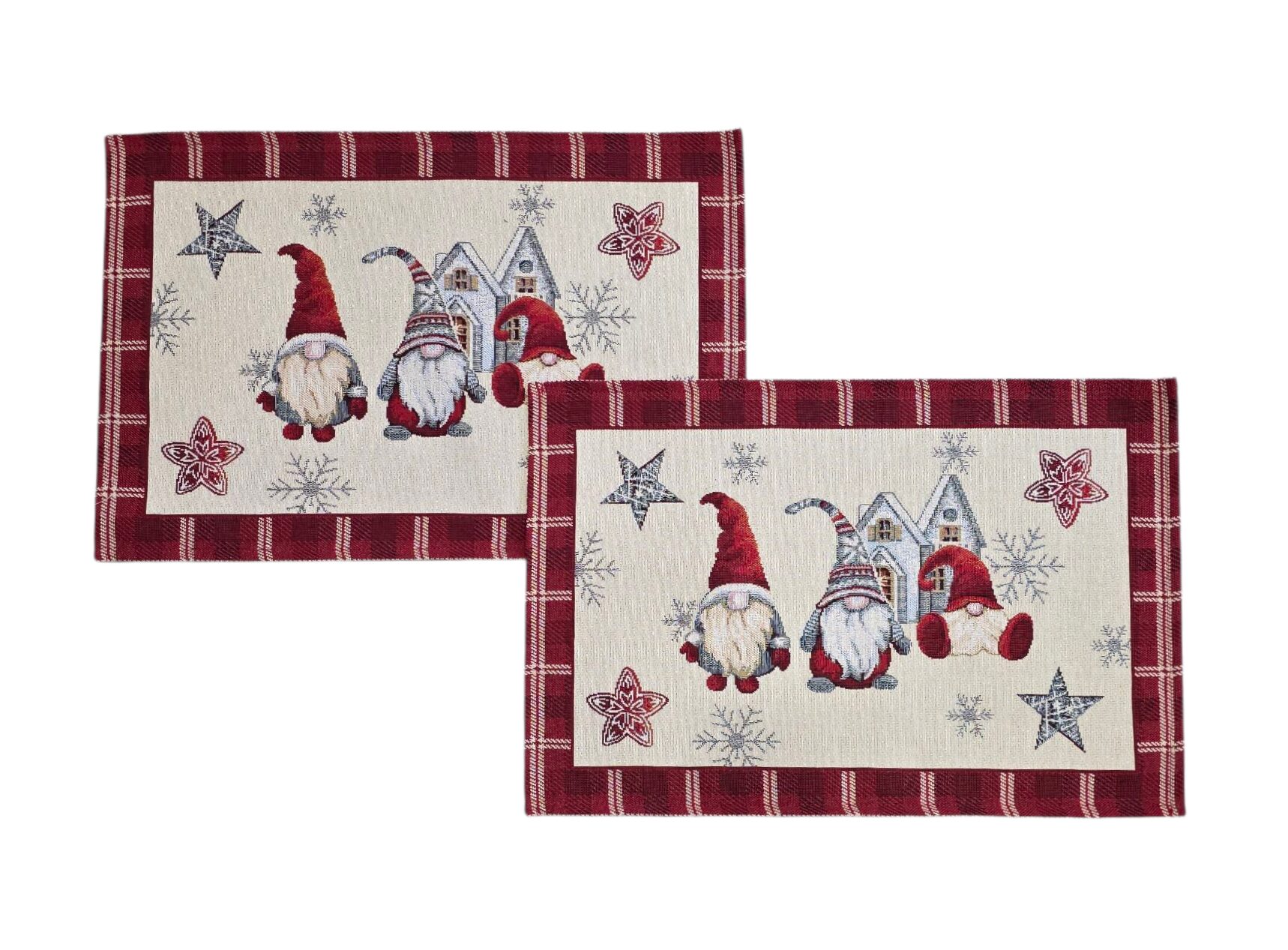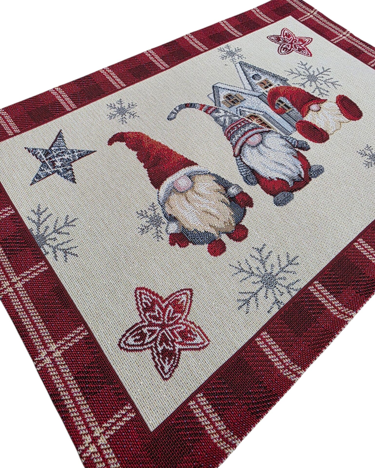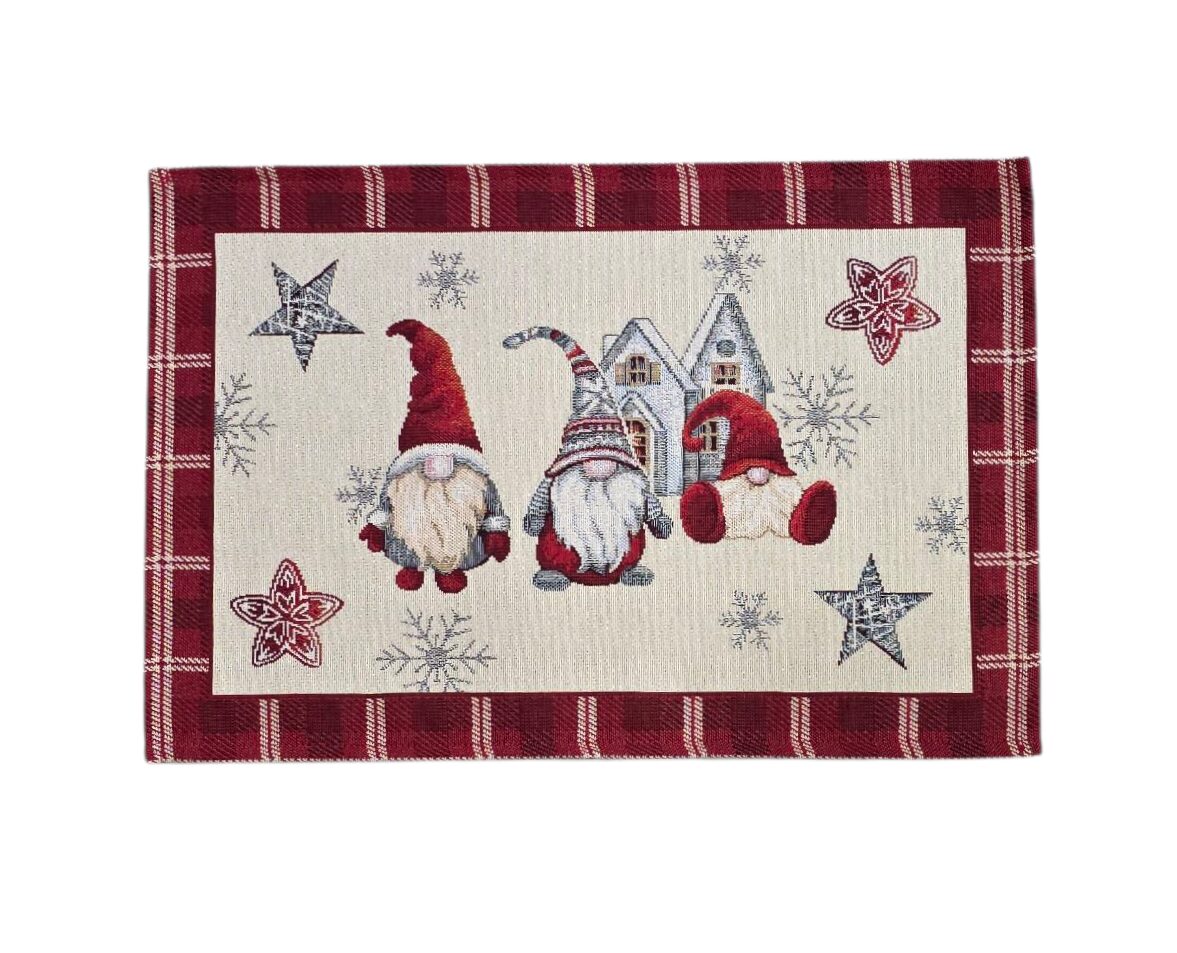 Aggiungi un tocco di magia natalizia alla tua tavola con queste incantevoli tovagliette in gobelin. La tovagliette è delle dimensioni di 33×49 cm, perfette per creare un’atmosfera festiva. Il design presenta adorabili gnomi natalizi con cappelli rossi e lunghe barbe bianche, accompagnati da stelle decorative, fiocchi di neve e una graziosa casetta invernale sullo sfondo. La bordatura scozzese in rosso bordeaux aggiunge un elemento classico e raffinato al design. Realizzate in tessuto gobelin di alta qualità , queste tovagliette sono sia decorative che pratiche. I dettagli in lurex oro aggiungono un sottile scintillio che cattura la luce, creando un’atmosfera ancora più festosa. Ideali per la tavola natalizia, queste tovagliette combinano perfettamente lo spirito tradizionale del Natale con un design contemporaneo che si adatta a qualsiasi arredamento festivo.